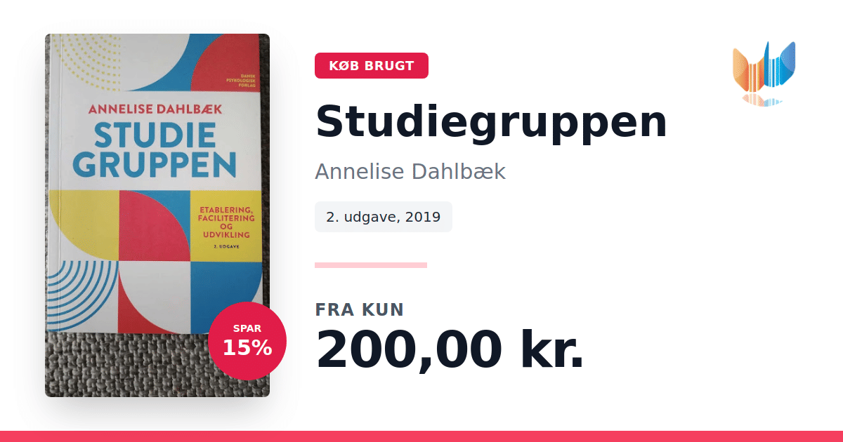 Lige nu kan du købe "Studiegruppen" af Annelise Dahlbæk til kun 200,00 kr. Du sparer hele 15% af nyprisen! Bogen du ser her er brugt, og i perfekt stand. Vi har i øjeblikket 2 eksemplarer til salg af "Studiegruppen", så husk at se de forskellige udgaver.