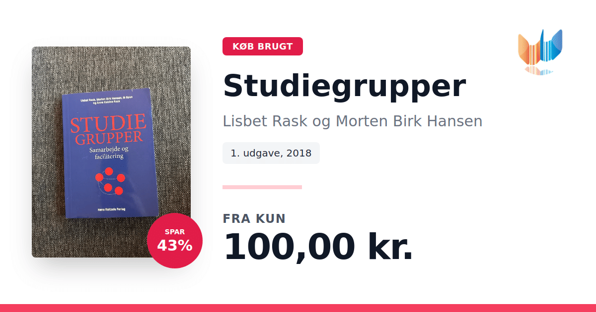 Lige nu kan du købe "Studiegrupper" af Lisbet Rask og Morten Birk Hansen til kun 100,00 kr. Du sparer hele 43% af nyprisen! Bogen du ser her er brugt, og i perfekt stand. Vi har i øjeblikket 2 eksemplarer til salg af "Studiegrupper", så husk at se de forskellige udgaver.