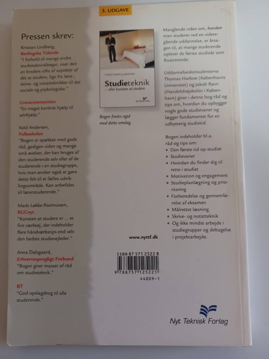 Studieteknik – eller kunsten at studere er en praktisk guide designet til at gøre overgangen til videregående studier lettere og mere overskuelig. Bogen tager udgangspunkt i de udfordringer, mange studerende møder, når de pludselig skal navigere i en mere kompleks studiehverdag, og giver konkrete råd til, hvordan man etablerer gode studievaner fra starten. Med en række velafprøvede teknikker og strategier viser Jakob Ravn, hvordan man effektivt planlægger sin studietid, forbereder sig til eksamen og håndterer gruppearbejde. Bogen giver både inspiration til den studerende, der er på vej ind på en videregående uddannelse, og støtte til den, der ønsker at optimere sin nuværende studiepraksis. Gennem praktiske eksempler og gennemarbejdede studietips bliver læseren guidet til at skabe et solidt fundament for et udbytterigt studieforløb. Studieteknik er derfor et uundværligt redskab for alle, der vil lære kunsten at studere på en systematisk og reflekteret måde.