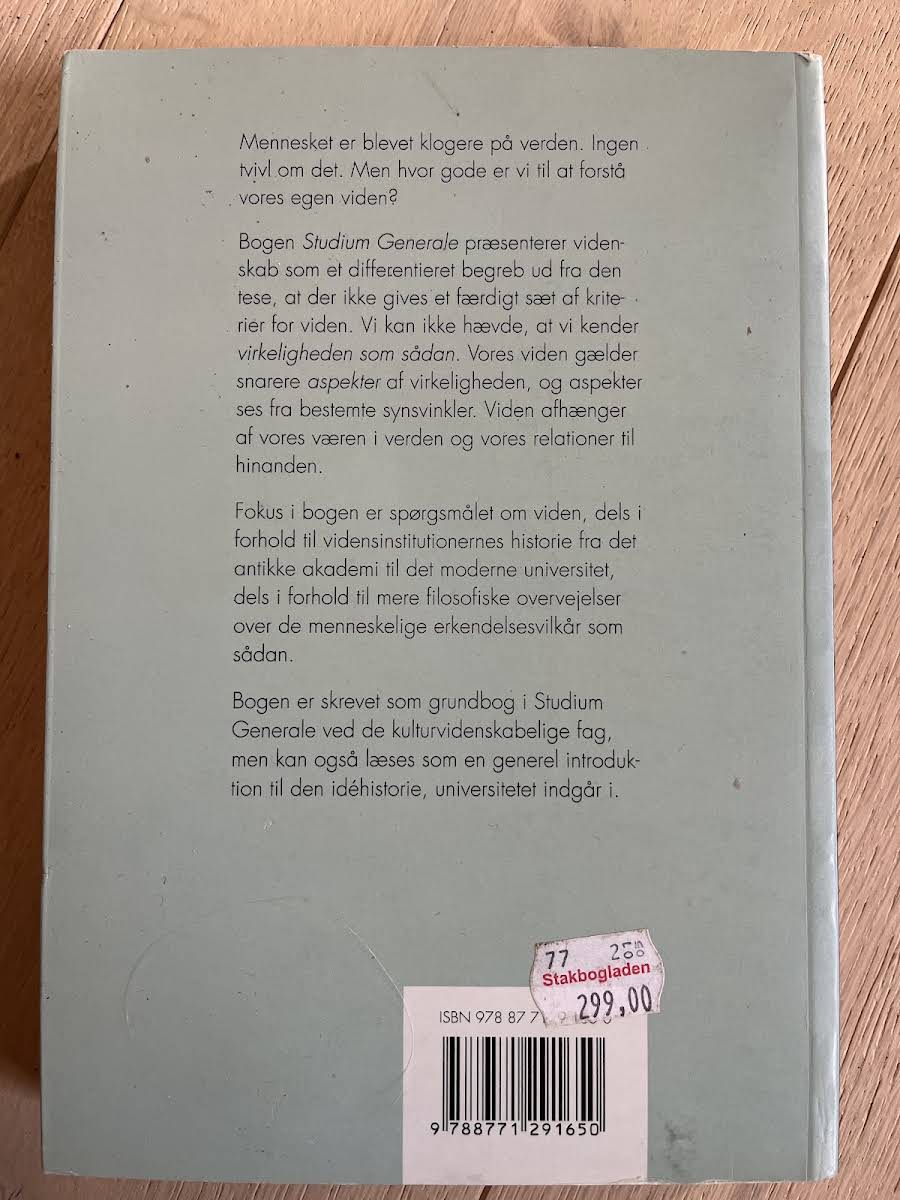 "Studium Generale" er en tankevækkende undersøgelse af, hvordan vi tilgår og forstår viden. Lars Albinus stiller skarpt på, at vores erkendelse af verden ikke giver et fuldstændigt billede, men snarere skildrer forskellige aspekter afhængigt af vores relationer og kontekst. Bogen belyser, hvordan vidensinstitutionerne – fra det antikke akademi til det moderne universitet – har formet vores måde at tænke på. Gennem en rejse i idéhistorien og humanistisk videnskabsteori reflekteres over, hvordan vi forstår virkeligheden ud fra bestemte perspektiver og betingelser. Som grundbog for Studium Generale ved kulturelle og humanistiske fag henvender bogen sig til alle, der ønsker en dybere forståelse af, hvordan videnskab og viden er konstitueret. Med sit skarpe blik på erkendelsens begrænsninger byder bogen på en inspirerende indgang til de komplekse forhold mellem menneskelig erfaring og den verden, vi forsøger at forstå.