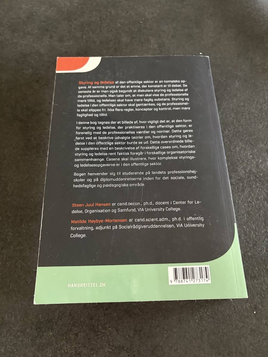 • Styring og ledelse af professionelle i den offentlige sektor, Steen Juul Hansen, Caroline Howard Grøn, Klaus Majgaard, Matilde Høybye-Mortensen, Anders Bøggild Christensen, Thorsten Braun, Else Marie Dalgaard Frandsen, Ida Schrøder, Lena Aarup Kjeldsen, 9788741273174