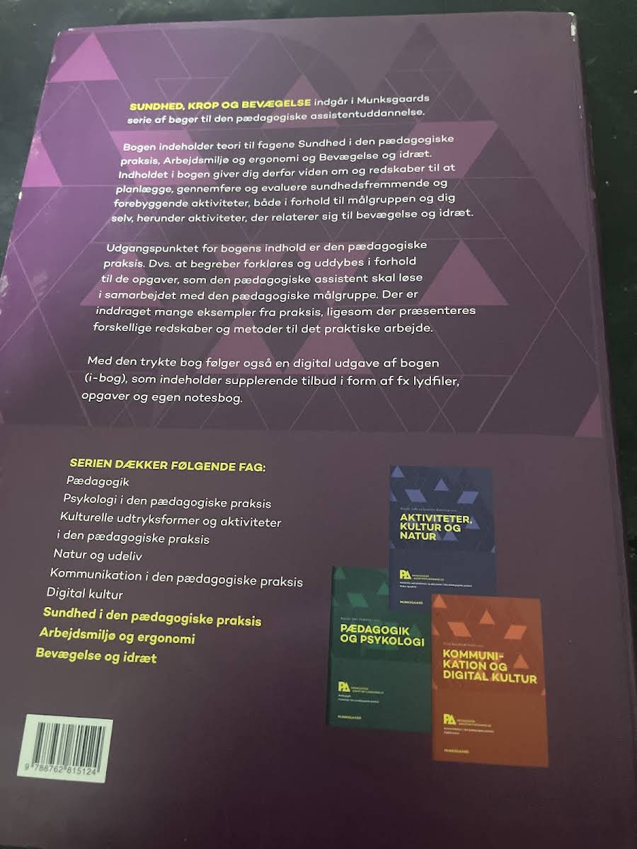 Sundhed, krop og bevægelse. Pædagogisk assistent (med iBog) er en grundbog, der henvender sig til dig, der skal arbejde som pædagogisk assistent. Bogen præsenterer centrale teorier inden for sundhed i den pædagogiske praksis, bevægelse og idræt samt arbejdsmiljø og ergonomi – alle med udgangspunkt i den praksis, du skal møde i din hverdag. Forfattergruppen, bestående af blandt andre Anja Semke, Henrik Wiben, Lone Andersen, Anne-Merete Kissow og flere, forklarer og uddyber nøglebegreberne gennem eksempler fra virkeligheden. Bogen trækker på både klassiske og nyere teorier, samtidig med at den præsenterer alsidige metoder og redskaber med praktisk anvendelse. Bogen tilbydes som fast hærdet udgave og inkluderer adgang til digitalt supplerende materiale via iBog. Her finder du ekstra ressourcer såsom lydfiler, film, opgaver og notatmuligheder, der understøtter læringsprocessen og gør stoffet mere tilgængeligt.