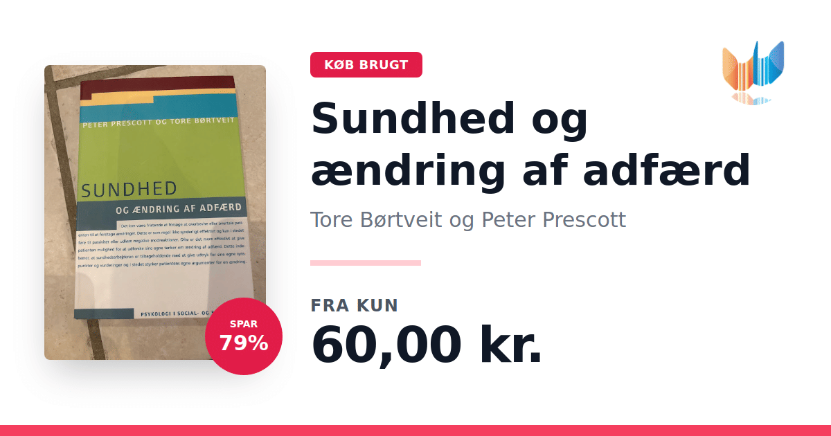 Lige nu kan du købe "Sundhed og ændring af adfærd" af Tore Børtveit og Peter Prescott til kun 60,00 kr. Du sparer hele 79% af nyprisen! Bogen du ser her er brugt, og i god stand. Vi har i øjeblikket 2 eksemplarer til salg af "Sundhed og ændring af adfærd", så husk at se de forskellige udgaver.