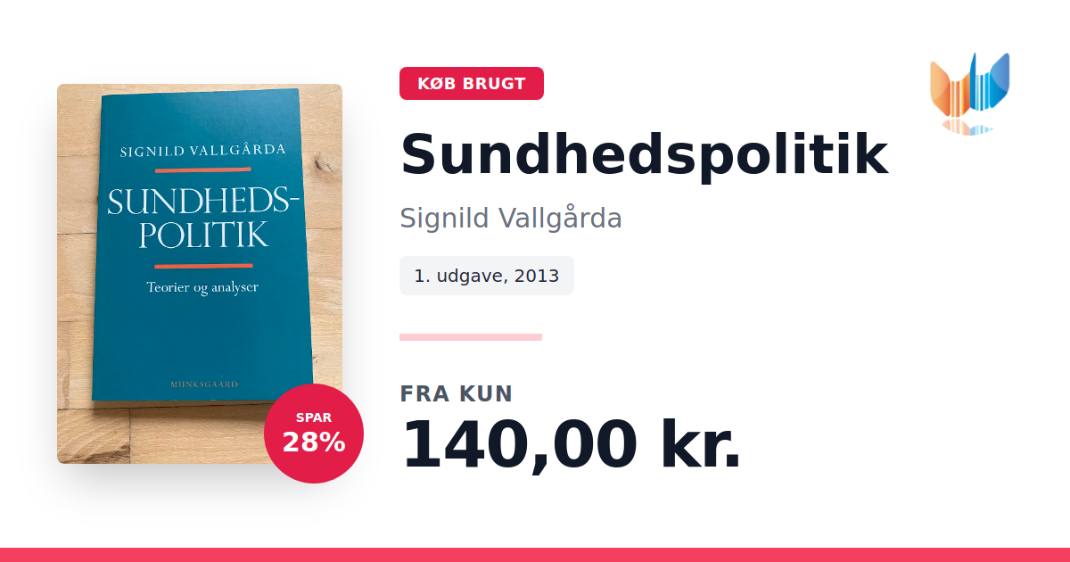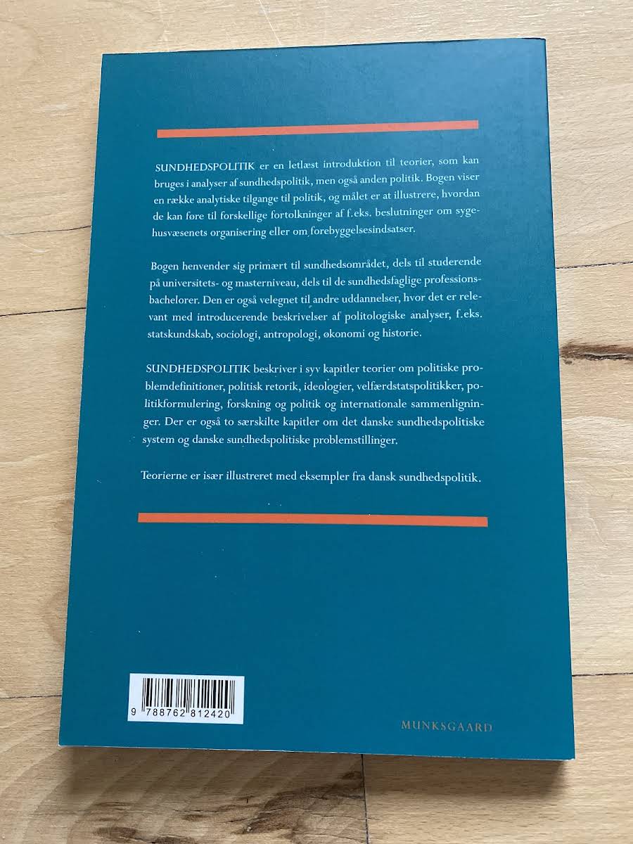 Sundhedspolitik af Signild Vallgårda giver en klar introduktion til de teoretiske tilgange, der benyttes i analysen af sundhedspolitik. Bogen præsenterer en række analytiske metoder, som sætter fokus på, hvordan politiske beslutninger og sundhedspolitiske problemstillinger opstår og formes. I syv kapitler udforskes emner som politiske problemdefinitioner, retorik, ideologier, politikformulering, forskning og internationale perspektiver. To af kapitlerne beskæftiger sig specifikt med det danske sundhedspolitiske system samt de udprægede nationale udfordringer. Bogen henvender sig primært til studerende på universitets- og masterniveau samt til de sundhedsfaglige professionsbachelorer, men dens analytiske tilgang gør den også relevant for andre undervisningsretninger, hvor politiske analyser er centrale. Med illustrative eksempler fra den danske sundhedspolitik giver Vallgårda læseren et nuanceret overblik, der åbner op for forskellige fortolkninger af sundhedspolitiske beslutninger og processer.