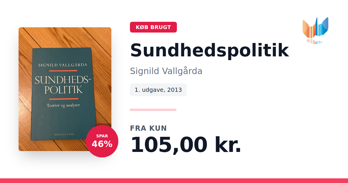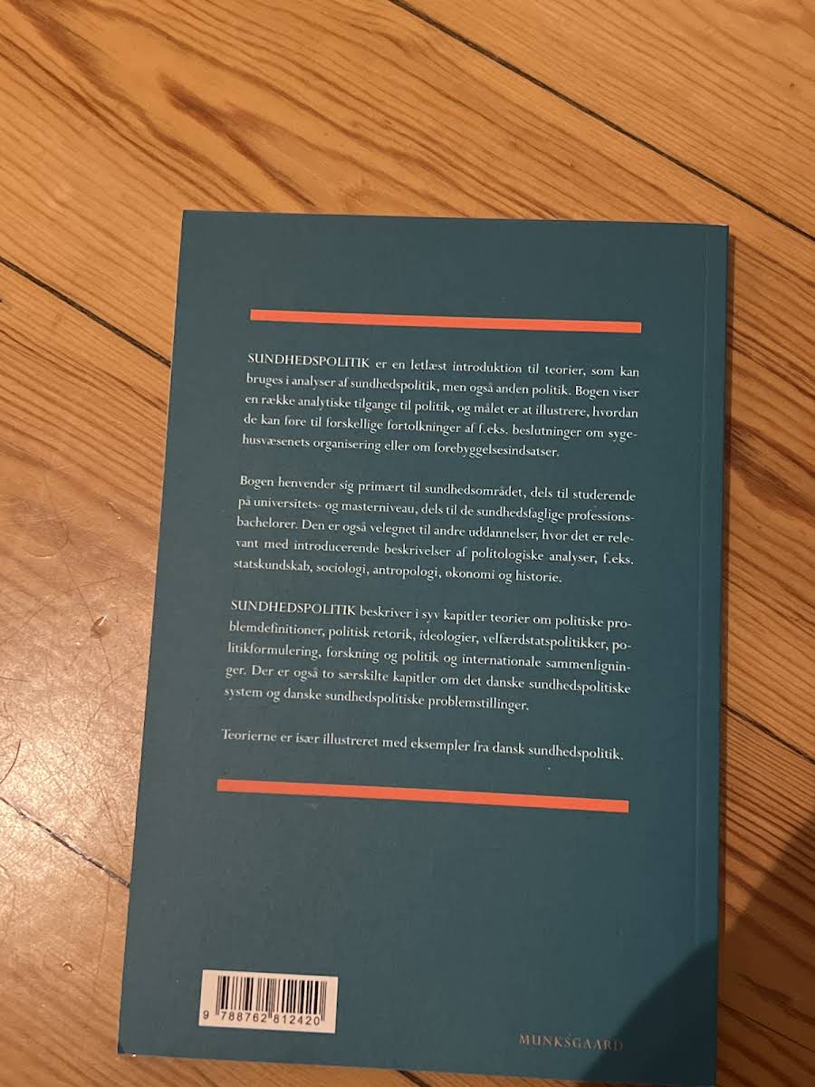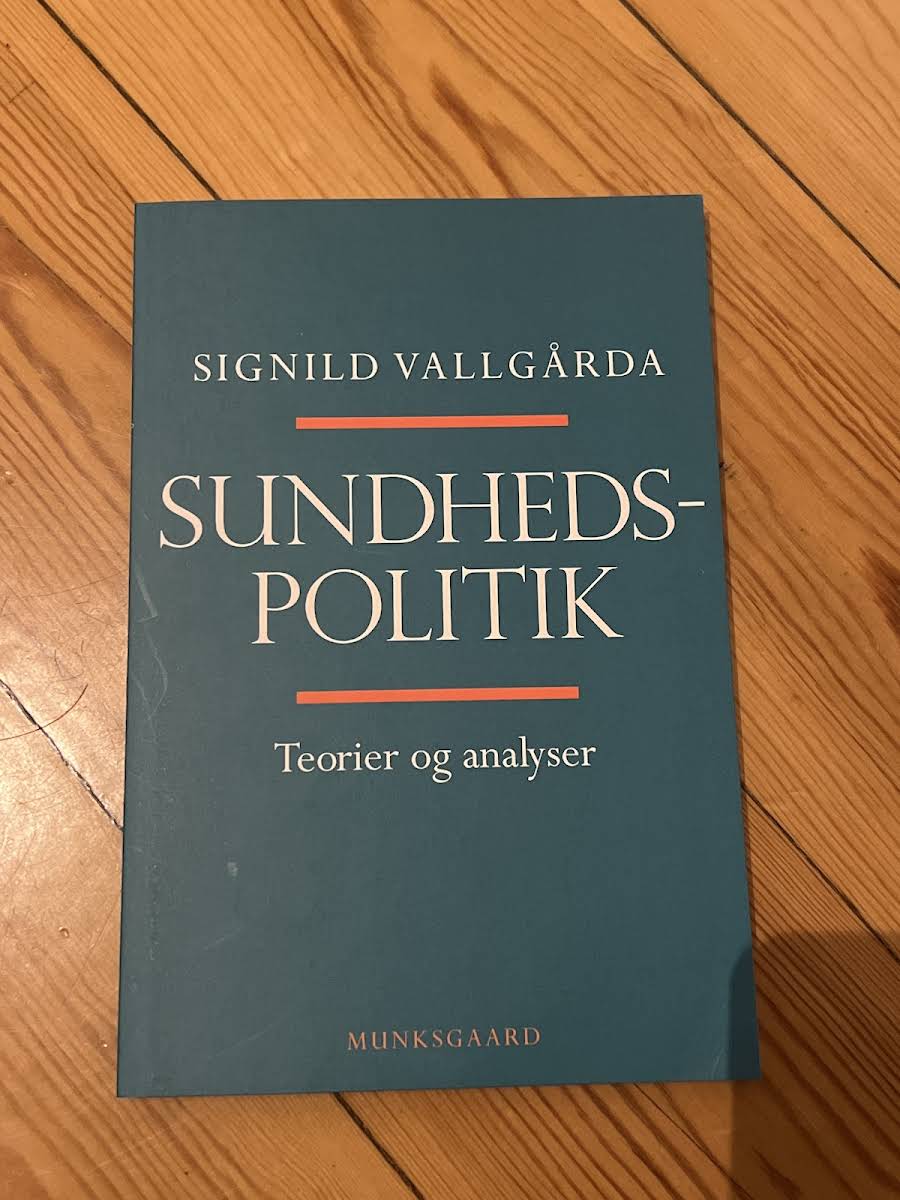 Sundhedspolitik af Signild Vallgårda giver en klar introduktion til de teoretiske tilgange, der benyttes i analysen af sundhedspolitik. Bogen præsenterer en række analytiske metoder, som sætter fokus på, hvordan politiske beslutninger og sundhedspolitiske problemstillinger opstår og formes. I syv kapitler udforskes emner som politiske problemdefinitioner, retorik, ideologier, politikformulering, forskning og internationale perspektiver. To af kapitlerne beskæftiger sig specifikt med det danske sundhedspolitiske system samt de udprægede nationale udfordringer. Bogen henvender sig primært til studerende på universitets- og masterniveau samt til de sundhedsfaglige professionsbachelorer, men dens analytiske tilgang gør den også relevant for andre undervisningsretninger, hvor politiske analyser er centrale. Med illustrative eksempler fra den danske sundhedspolitik giver Vallgårda læseren et nuanceret overblik, der åbner op for forskellige fortolkninger af sundhedspolitiske beslutninger og processer.