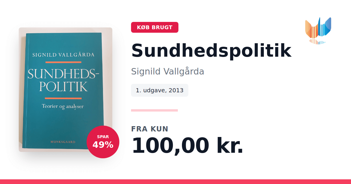 Sundhedspolitik af Signild Vallgårda giver en klar introduktion til de teoretiske tilgange, der benyttes i analysen af sundhedspolitik. Bogen præsenterer en række analytiske metoder, som sætter fokus på, hvordan politiske beslutninger og sundhedspolitiske problemstillinger opstår og formes. I syv kapitler udforskes emner som politiske problemdefinitioner, retorik, ideologier, politikformulering, forskning og internationale perspektiver. To af kapitlerne beskæftiger sig specifikt med det danske sundhedspolitiske system samt de udprægede nationale udfordringer. Bogen henvender sig primært til studerende på universitets- og masterniveau samt til de sundhedsfaglige professionsbachelorer, men dens analytiske tilgang gør den også relevant for andre undervisningsretninger, hvor politiske analyser er centrale. Med illustrative eksempler fra den danske sundhedspolitik giver Vallgårda læseren et nuanceret overblik, der åbner op for forskellige fortolkninger af sundhedspolitiske beslutninger og processer.