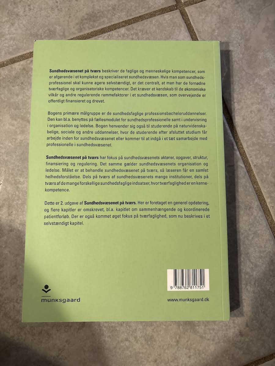 Sundhedsvæsenet på tværs tilbyder en nuanceret gennemgang af de faglige og menneskelige kompetencer, der er essentielle for at navigere i et komplekst og specialiseret sundhedsvæsen. Bogen understreger vigtigheden af tværfaglige og organisatoriske færdigheder, såvel som indsigt i de økonomiske vilkår og regulerende rammer, der præger et overvejende offentligt finansieret sundhedsvæsen. Henvendt primært til uddannelser inden for sundhedsprofessionelle professionsbachelorer, fungerer bogen som et redskab til at forstå sundhedsvæsenets aktører, opgaver, struktur, finansiering og ledelse. Den er også relevant for studerende fra naturvidenskabelige, sociale og andre fagområder, der enten træder ind i sundhedsvæsenet eller vil samarbejde tæt med sundhedsprofessionelle. I denne 2. udgave er der foretaget en generel opdatering, med omskrevne kapitler om koordinering af patientforløb samt et øget og selvstændigt fokus på tværfaglighed.