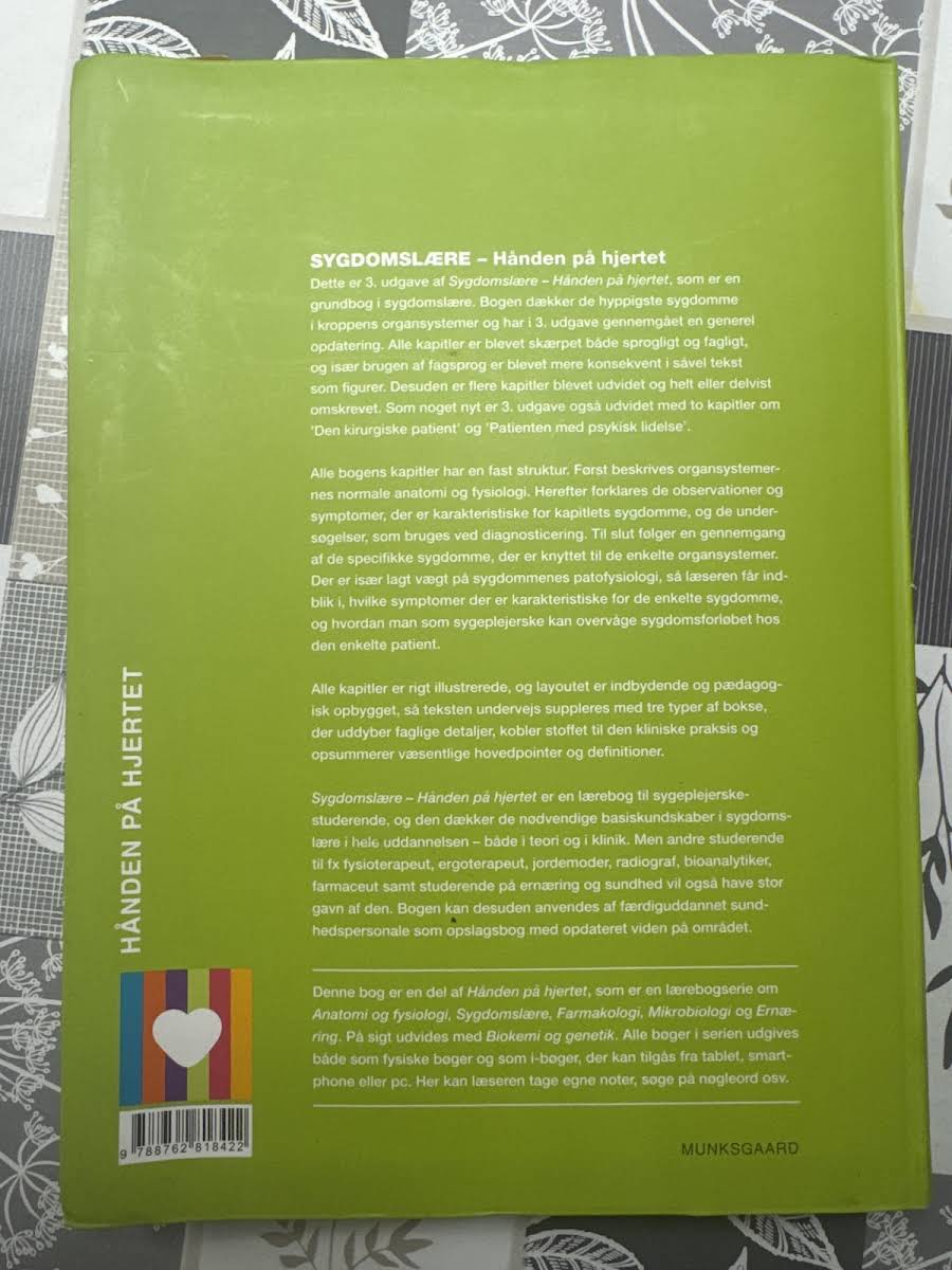 Dette er 3. udgave af grundbogen Sygdomslære – Hånden på hjertet. I denne opdaterede version er hele bogen finpudset sprogligt og fagligt, og flere kapitler er blevet udvidet, omskrevet eller fået fornyet indhold. Især er der tilføjet to nye kapitler om Den kirurgiske patient samt Patienten med psykisk lidelse, hvilket giver en bredere indsigt i kliniske udfordringer. Bogen opbygger hvert kapitel med en fast struktur, hvor der først fokuseres på den normale anatomi og fysiologi, hvorefter de karakteristiske observationer, symptomer og de nødvendige diagnostiske undersøgelser bliver gennemgået. Herefter tilbydes en dybdegående redegørelse for de specifikke sygdomme knyttet til hvert organsystem med særlig vægt på patofysiologi og sygdomsforløb. Sygdomslære – Hånden på hjertet fungerer som et uvurderligt redskab for sygeplejerskestuderende og andre sundhedsprofessionelle. Med sine 712 sider dækker bogen de væsentligste basiskundskaber i sygdomslære og giver et solidt fundament både til teoretisk studie og til klinisk praksis.