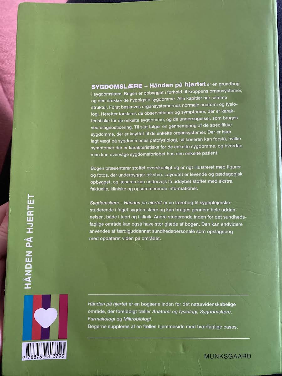 Sygdomslære - hånden på hjertet, 2. udgave, er en grundlæggende lærebog, der giver et solidt indblik i sygdomslære. Bogen kombinerer den traditionelle tekst med en digital i-bog, der beriger læseoplevelsen med øvelser, animationer, quizzer, en notesbog og andet understøttende materiale. Den digitale udgave supplerer tekst og illustrationer, hvilket gør stoffet let at tilegne sig. Stoffet er struktureret efter kroppens organsystemer og omfatter de mest udbredte sygdomme. Hvert kapitel indledes med en gennemgang af organsystemernes normale anatomi og fysiologi, hvorefter observationer, typiske symptomer og undersøgelsesmetoder beskrives. Der lægges særlig vægt på patofysiologien, så læseren opnår en dybere forståelse af, hvordan symptomer opstår og monitoreres over tid. Med rige illustrationer, figurer og fotos præsenteres stoffet overskueligt og pædagogisk, hvilket gør bogen ideel for sygeplejerskestuderende samt andre sundhedsfaglige, der ønsker en opdateret og tydelig introduktion til sygdomslære.