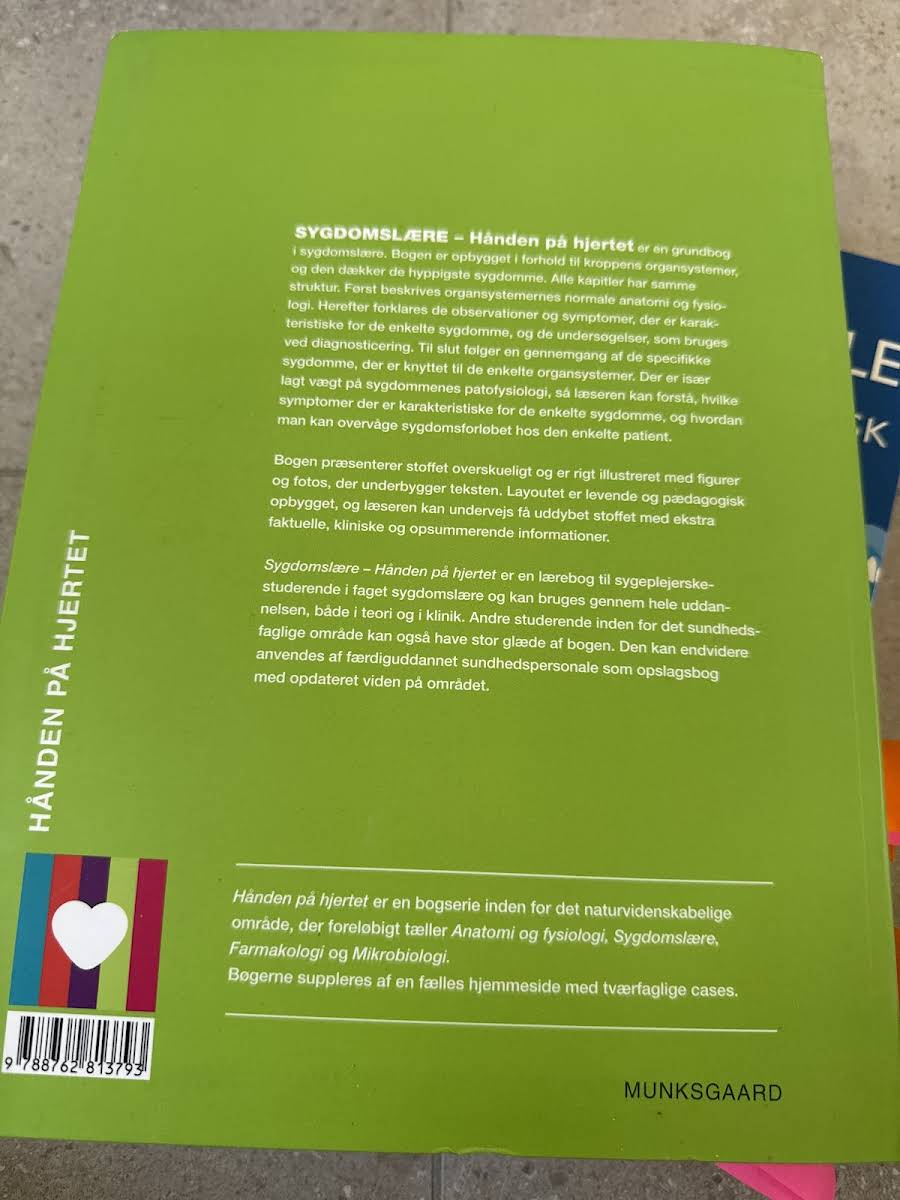 Sygdomslære - hånden på hjertet, 2. udgave, er en grundlæggende lærebog, der giver et solidt indblik i sygdomslære. Bogen kombinerer den traditionelle tekst med en digital i-bog, der beriger læseoplevelsen med øvelser, animationer, quizzer, en notesbog og andet understøttende materiale. Den digitale udgave supplerer tekst og illustrationer, hvilket gør stoffet let at tilegne sig. Stoffet er struktureret efter kroppens organsystemer og omfatter de mest udbredte sygdomme. Hvert kapitel indledes med en gennemgang af organsystemernes normale anatomi og fysiologi, hvorefter observationer, typiske symptomer og undersøgelsesmetoder beskrives. Der lægges særlig vægt på patofysiologien, så læseren opnår en dybere forståelse af, hvordan symptomer opstår og monitoreres over tid. Med rige illustrationer, figurer og fotos præsenteres stoffet overskueligt og pædagogisk, hvilket gør bogen ideel for sygeplejerskestuderende samt andre sundhedsfaglige, der ønsker en opdateret og tydelig introduktion til sygdomslære.