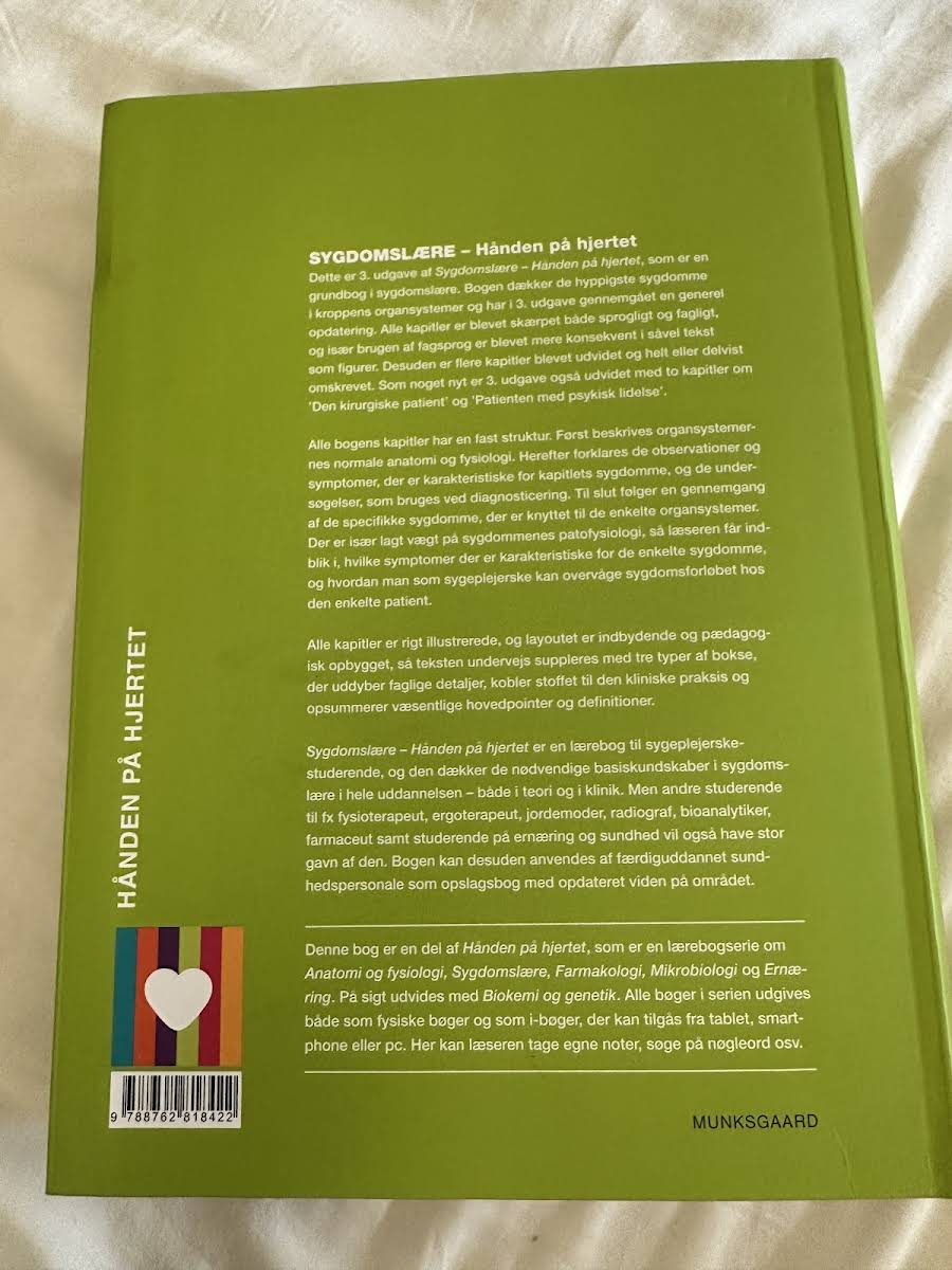 Dette er 3. udgave af grundbogen Sygdomslære – Hånden på hjertet. I denne opdaterede version er hele bogen finpudset sprogligt og fagligt, og flere kapitler er blevet udvidet, omskrevet eller fået fornyet indhold. Især er der tilføjet to nye kapitler om Den kirurgiske patient samt Patienten med psykisk lidelse, hvilket giver en bredere indsigt i kliniske udfordringer. Bogen opbygger hvert kapitel med en fast struktur, hvor der først fokuseres på den normale anatomi og fysiologi, hvorefter de karakteristiske observationer, symptomer og de nødvendige diagnostiske undersøgelser bliver gennemgået. Herefter tilbydes en dybdegående redegørelse for de specifikke sygdomme knyttet til hvert organsystem med særlig vægt på patofysiologi og sygdomsforløb. Sygdomslære – Hånden på hjertet fungerer som et uvurderligt redskab for sygeplejerskestuderende og andre sundhedsprofessionelle. Med sine 712 sider dækker bogen de væsentligste basiskundskaber i sygdomslære og giver et solidt fundament både til teoretisk studie og til klinisk praksis.