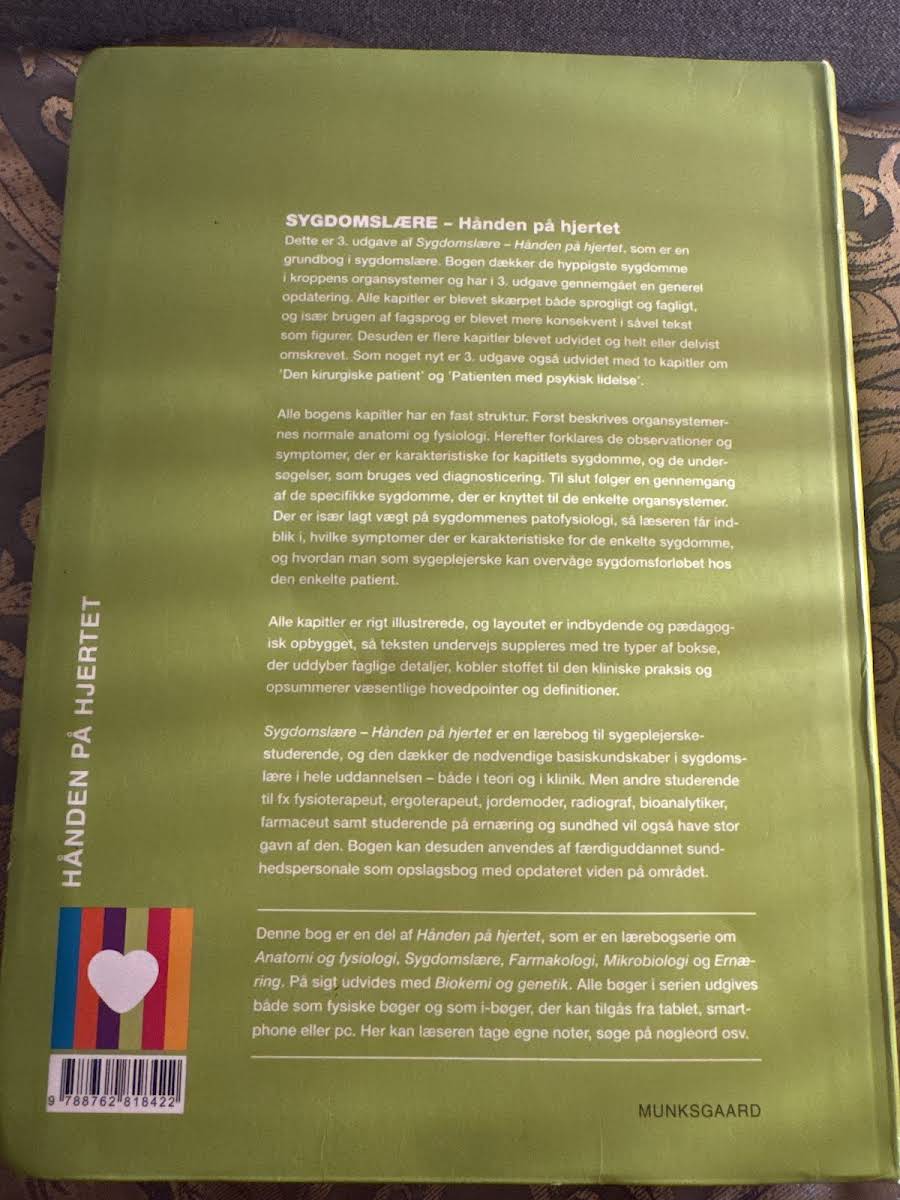 Dette er 3. udgave af grundbogen Sygdomslære – Hånden på hjertet. I denne opdaterede version er hele bogen finpudset sprogligt og fagligt, og flere kapitler er blevet udvidet, omskrevet eller fået fornyet indhold. Især er der tilføjet to nye kapitler om Den kirurgiske patient samt Patienten med psykisk lidelse, hvilket giver en bredere indsigt i kliniske udfordringer. Bogen opbygger hvert kapitel med en fast struktur, hvor der først fokuseres på den normale anatomi og fysiologi, hvorefter de karakteristiske observationer, symptomer og de nødvendige diagnostiske undersøgelser bliver gennemgået. Herefter tilbydes en dybdegående redegørelse for de specifikke sygdomme knyttet til hvert organsystem med særlig vægt på patofysiologi og sygdomsforløb. Sygdomslære – Hånden på hjertet fungerer som et uvurderligt redskab for sygeplejerskestuderende og andre sundhedsprofessionelle. Med sine 712 sider dækker bogen de væsentligste basiskundskaber i sygdomslære og giver et solidt fundament både til teoretisk studie og til klinisk praksis.