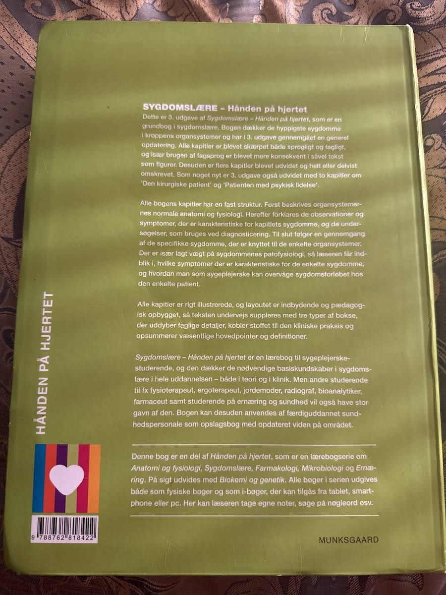 Dette er 3. udgave af grundbogen Sygdomslære – Hånden på hjertet. I denne opdaterede version er hele bogen finpudset sprogligt og fagligt, og flere kapitler er blevet udvidet, omskrevet eller fået fornyet indhold. Især er der tilføjet to nye kapitler om Den kirurgiske patient samt Patienten med psykisk lidelse, hvilket giver en bredere indsigt i kliniske udfordringer. Bogen opbygger hvert kapitel med en fast struktur, hvor der først fokuseres på den normale anatomi og fysiologi, hvorefter de karakteristiske observationer, symptomer og de nødvendige diagnostiske undersøgelser bliver gennemgået. Herefter tilbydes en dybdegående redegørelse for de specifikke sygdomme knyttet til hvert organsystem med særlig vægt på patofysiologi og sygdomsforløb. Sygdomslære – Hånden på hjertet fungerer som et uvurderligt redskab for sygeplejerskestuderende og andre sundhedsprofessionelle. Med sine 712 sider dækker bogen de væsentligste basiskundskaber i sygdomslære og giver et solidt fundament både til teoretisk studie og til klinisk praksis.