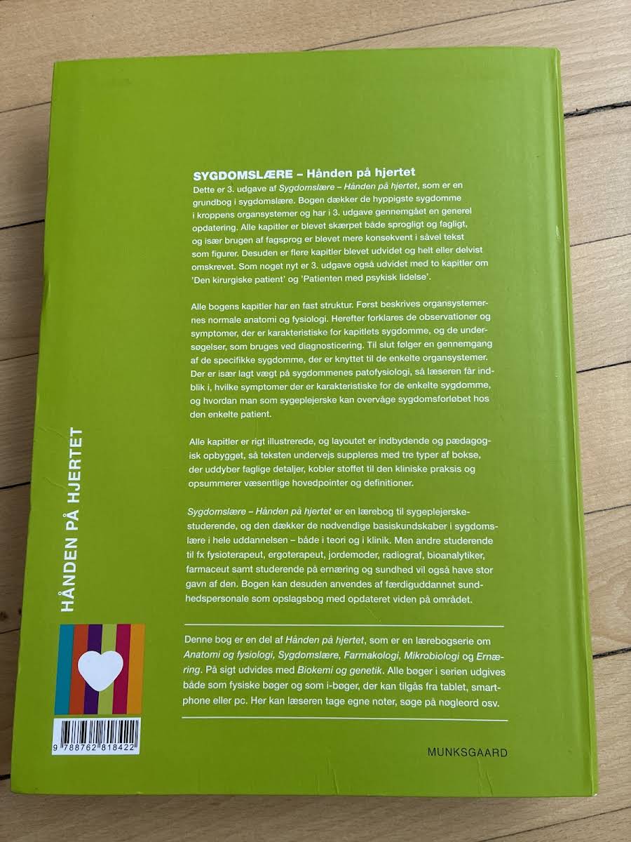 Dette er 3. udgave af grundbogen Sygdomslære – Hånden på hjertet. I denne opdaterede version er hele bogen finpudset sprogligt og fagligt, og flere kapitler er blevet udvidet, omskrevet eller fået fornyet indhold. Især er der tilføjet to nye kapitler om Den kirurgiske patient samt Patienten med psykisk lidelse, hvilket giver en bredere indsigt i kliniske udfordringer. Bogen opbygger hvert kapitel med en fast struktur, hvor der først fokuseres på den normale anatomi og fysiologi, hvorefter de karakteristiske observationer, symptomer og de nødvendige diagnostiske undersøgelser bliver gennemgået. Herefter tilbydes en dybdegående redegørelse for de specifikke sygdomme knyttet til hvert organsystem med særlig vægt på patofysiologi og sygdomsforløb. Sygdomslære – Hånden på hjertet fungerer som et uvurderligt redskab for sygeplejerskestuderende og andre sundhedsprofessionelle. Med sine 712 sider dækker bogen de væsentligste basiskundskaber i sygdomslære og giver et solidt fundament både til teoretisk studie og til klinisk praksis.