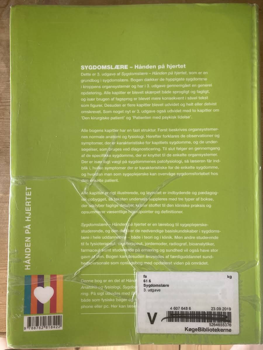 Dette er 3. udgave af grundbogen Sygdomslære – Hånden på hjertet. I denne opdaterede version er hele bogen finpudset sprogligt og fagligt, og flere kapitler er blevet udvidet, omskrevet eller fået fornyet indhold. Især er der tilføjet to nye kapitler om Den kirurgiske patient samt Patienten med psykisk lidelse, hvilket giver en bredere indsigt i kliniske udfordringer. Bogen opbygger hvert kapitel med en fast struktur, hvor der først fokuseres på den normale anatomi og fysiologi, hvorefter de karakteristiske observationer, symptomer og de nødvendige diagnostiske undersøgelser bliver gennemgået. Herefter tilbydes en dybdegående redegørelse for de specifikke sygdomme knyttet til hvert organsystem med særlig vægt på patofysiologi og sygdomsforløb. Sygdomslære – Hånden på hjertet fungerer som et uvurderligt redskab for sygeplejerskestuderende og andre sundhedsprofessionelle. Med sine 712 sider dækker bogen de væsentligste basiskundskaber i sygdomslære og giver et solidt fundament både til teoretisk studie og til klinisk praksis.