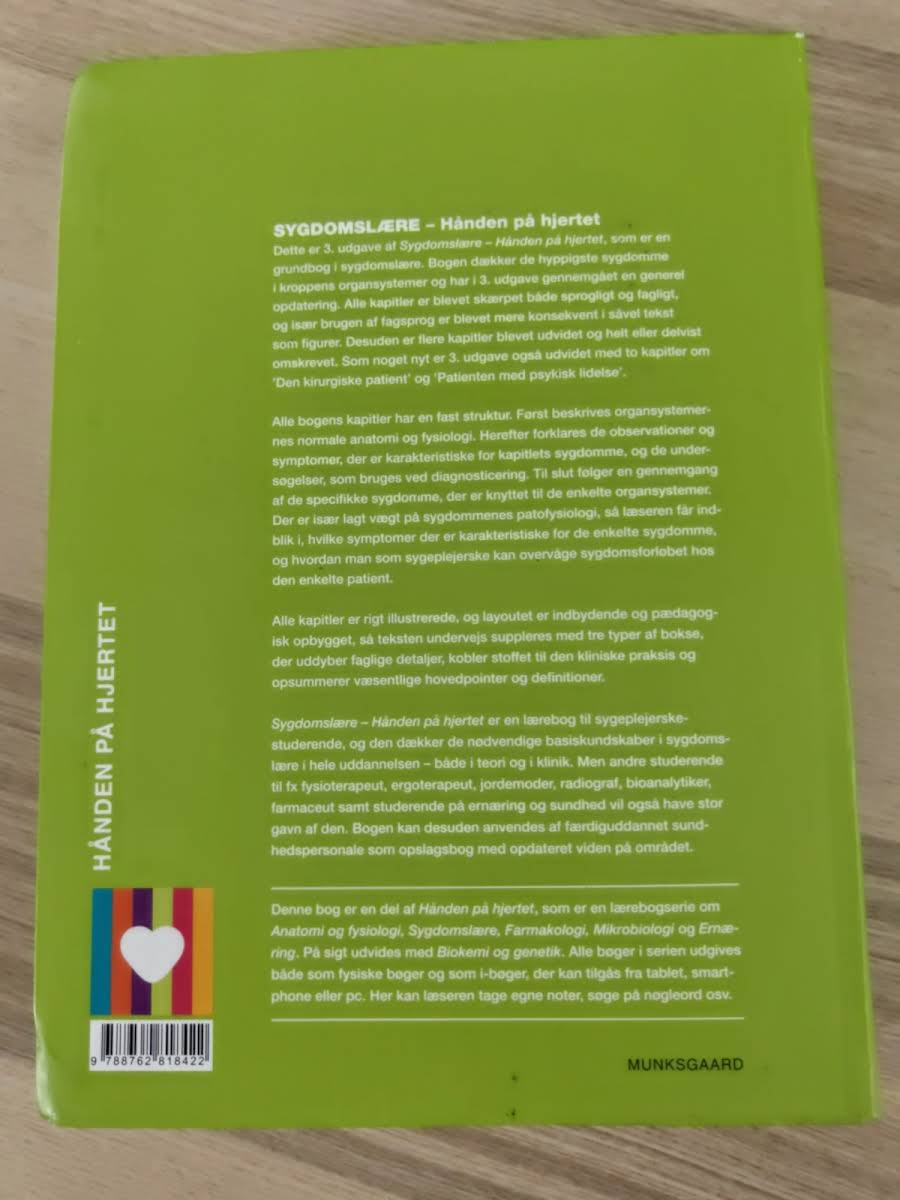 Dette er 3. udgave af grundbogen Sygdomslære – Hånden på hjertet. I denne opdaterede version er hele bogen finpudset sprogligt og fagligt, og flere kapitler er blevet udvidet, omskrevet eller fået fornyet indhold. Især er der tilføjet to nye kapitler om Den kirurgiske patient samt Patienten med psykisk lidelse, hvilket giver en bredere indsigt i kliniske udfordringer. Bogen opbygger hvert kapitel med en fast struktur, hvor der først fokuseres på den normale anatomi og fysiologi, hvorefter de karakteristiske observationer, symptomer og de nødvendige diagnostiske undersøgelser bliver gennemgået. Herefter tilbydes en dybdegående redegørelse for de specifikke sygdomme knyttet til hvert organsystem med særlig vægt på patofysiologi og sygdomsforløb. Sygdomslære – Hånden på hjertet fungerer som et uvurderligt redskab for sygeplejerskestuderende og andre sundhedsprofessionelle. Med sine 712 sider dækker bogen de væsentligste basiskundskaber i sygdomslære og giver et solidt fundament både til teoretisk studie og til klinisk praksis.