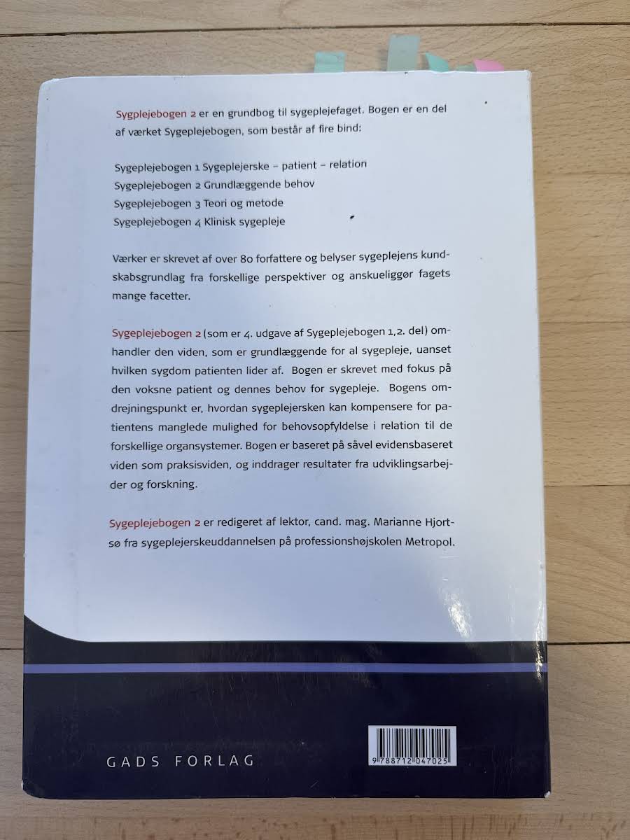 Sygeplejebogen 2 – Grundlæggende behov udgives nu i sin 4. udgave og er et redskab, der med fokus på de grundlæggende behov i sygeplejen understøtter de studerendes evne til at observere, reflektere og handle på kliniske udfordringer. Bogen er struktureret i overskuelige kapitler, der hver især bidrager til at styrke den studerendes faglige forståelse og observationskompetence. Indholdet er nøje tilpasset de læringsudbytter, som Studieordningen 2008 fastsætter for de første moduler på sygeplejerskeuddannelsen. Under redaktionen af Marianne Hjortsø kombineres erfaring fra klinisk praksis, pædagogik og forskning for at give læseren et solidt fundament i de sygeplejefaglige problemstillinger. Med en velkendt og genkendelig kapitelopbygning byder Sygeplejebogen 2 på et redskab, der på en overskuelig måde guider den studerende gennem de centrale emner i sygeplejefaget og understøtter den faglige og kliniske udvikling.