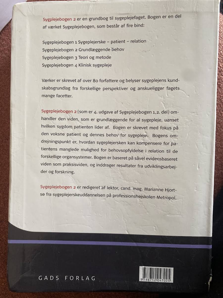 Sygeplejebogen 2 – Grundlæggende behov udgives nu i sin 4. udgave og er et redskab, der med fokus på de grundlæggende behov i sygeplejen understøtter de studerendes evne til at observere, reflektere og handle på kliniske udfordringer. Bogen er struktureret i overskuelige kapitler, der hver især bidrager til at styrke den studerendes faglige forståelse og observationskompetence. Indholdet er nøje tilpasset de læringsudbytter, som Studieordningen 2008 fastsætter for de første moduler på sygeplejerskeuddannelsen. Under redaktionen af Marianne Hjortsø kombineres erfaring fra klinisk praksis, pædagogik og forskning for at give læseren et solidt fundament i de sygeplejefaglige problemstillinger. Med en velkendt og genkendelig kapitelopbygning byder Sygeplejebogen 2 på et redskab, der på en overskuelig måde guider den studerende gennem de centrale emner i sygeplejefaget og understøtter den faglige og kliniske udvikling.
