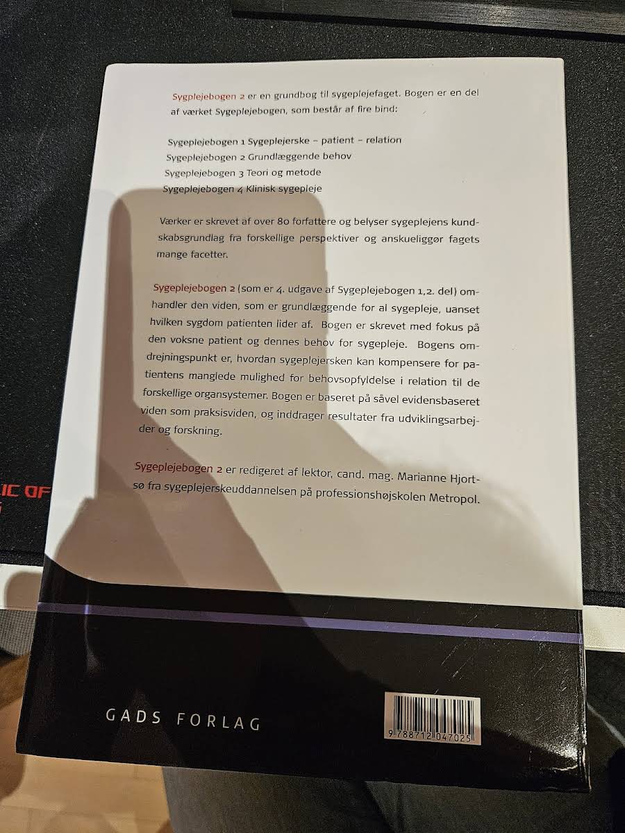 Sygeplejebogen 2 – Grundlæggende behov udgives nu i sin 4. udgave og er et redskab, der med fokus på de grundlæggende behov i sygeplejen understøtter de studerendes evne til at observere, reflektere og handle på kliniske udfordringer. Bogen er struktureret i overskuelige kapitler, der hver især bidrager til at styrke den studerendes faglige forståelse og observationskompetence. Indholdet er nøje tilpasset de læringsudbytter, som Studieordningen 2008 fastsætter for de første moduler på sygeplejerskeuddannelsen. Under redaktionen af Marianne Hjortsø kombineres erfaring fra klinisk praksis, pædagogik og forskning for at give læseren et solidt fundament i de sygeplejefaglige problemstillinger. Med en velkendt og genkendelig kapitelopbygning byder Sygeplejebogen 2 på et redskab, der på en overskuelig måde guider den studerende gennem de centrale emner i sygeplejefaget og understøtter den faglige og kliniske udvikling.