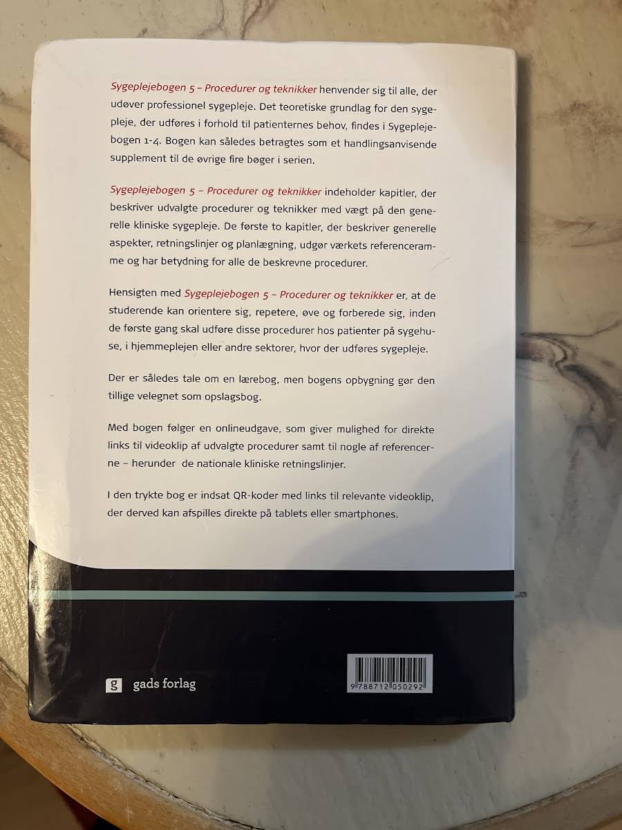 Sygeplejebogen 5: Procedurer og teknikker udgør det femte bind i den anerkendte serie, der spænder over både teoretiske og praktiske aspekter af sygeplejefaget. Denne første udgave, udgivet i 2015, er designet som et praktisk supplement, der understøtter sygeplejestuderende og andre faggrupper, som arbejder med sygepleje. Med et klart fokus på håndfaste metoder og teknikker, tjener bogen samtidig som et opslagsværk for den erfarne sygeplejerske. Redigeret af Karen Margrethe Maglekær og Pia Lysdal Veje præsenterer værket en række nøje beskrevne procedurer, der bygger bro mellem den teoretiske viden i de foregående bind og den praktiske anvendelse i klinisk hverdag. Med sine 288 sider er bogen et uundværligt redskab, der bidrager til en professionel og omsorgsfuld sygepleje, hvor både studerende og praktiserende nyder godt af en struktureret tilgang til hverdagens udfordringer.