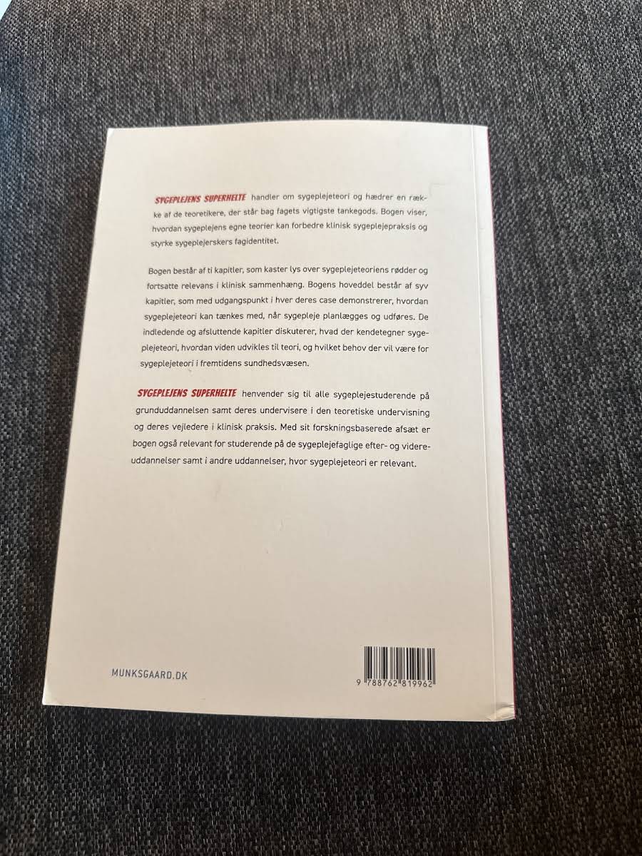 Sygeplejens superhelte hylder de teoretikere, der har formet grundlaget for sygeplejens teori og praksis. Bogen illustrerer, hvordan egne teorier både kan optimere den kliniske sygepleje og styrke sygeplejerskernes faglige identitet. Med ti kapitler brings sygeplejeteoriens rødder og dens fortsatte kliniske relevans frem i lyset. Særligt syv kapitler, struktureret omkring konkrete cases, viser, hvordan teori kan omsættes til praksis, når sygeplejetjenester planlægges og udføres. Desuden redegør de indledende og afsluttende kapitler for, hvad der kendetegner sygeplejeteori, og hvordan viden udvikles til teori. Bogen understreger også det fremtidige behov for teoretiske overvejelser i sundhedsvæsenet og henvender sig til både studerende, undervisere og vejledere inden for sundhedssektoren. Med sit forskningsbaserede udgangspunkt er Sygeplejens superhelte en inspirerende og vidensbaseret ressource, der også er relevant for efter- og videreuddannelser samt andre fagområder, hvor sygeplejeteori spiller en central rolle.