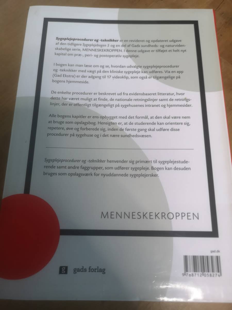 "Sygeplejeprocedurer og -teknikker" er en ny og opdateret udgave, der bygger videre på den tidligere version kendt som "Sygeplejebogen 5." Bogen præsenterer et nøje udvalg af centrale sygeplejeprocedurer og teknikker med fokus på den kliniske sygepleje i overensstemmelse med gældende evidens. I denne udgave er der tilføjet et helt nyt kapitel, der omhandler præ-, peri- og postoperativ sygepleje, suppleret med ekstra materiale, som understøtter den praktiske anvendelse i kliniske situationer. Med 273 sider giver denne paperback et solidt grundlag for både uddannelse og praksis, og den er redigeret af Karen Margrethe Maglekær med forfatterskab af Pia Lysdal Veje. Bogen er udgivet af Gad i 2019.