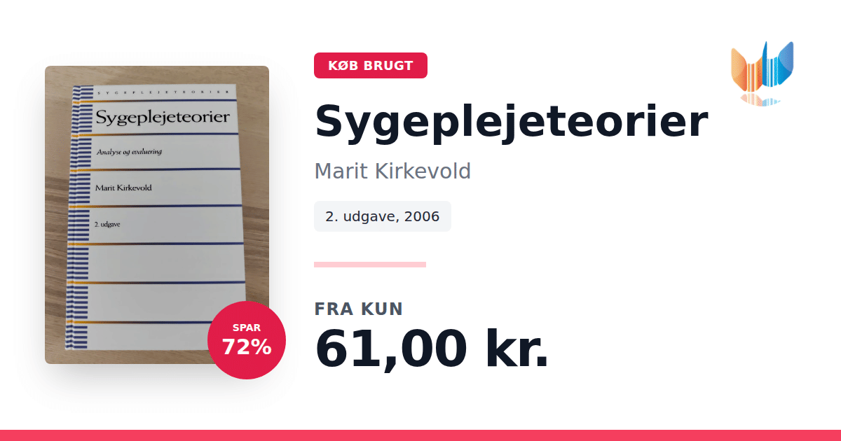 Lige nu kan du købe "Sygeplejeteorier" af Marit Kirkevold til kun 61,00 kr. Du sparer hele 72% af nyprisen! Bogen du ser her er brugt, og i god stand. Vi har i øjeblikket 5 eksemplarer til salg af "Sygeplejeteorier", så husk at se de forskellige udgaver.