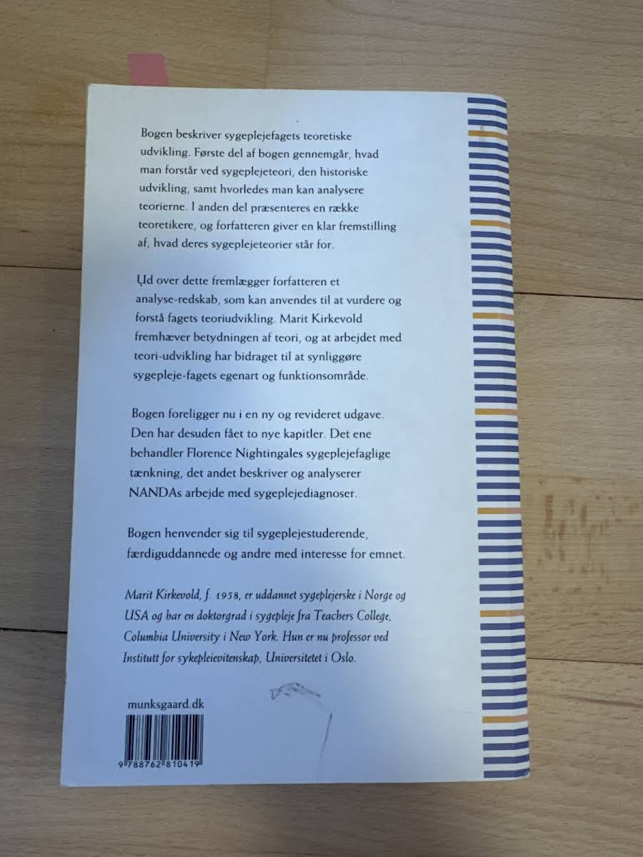"Sygeplejeteorier – Analyse og evaluering" giver et indblik i sygeplejefagets teoretiske fundament og udvikling. Bogen er struktureret i to hoveddele, hvor den første del introducerer, hvad sygeplejeteori indebærer, og kortlægger den historiske udvikling samt de metoder, der benyttes til at analysere teorier. I den anden del sættes fokus på en række centrale teoretikere, hvis arbejde har haft stor betydning for fagets udvikling. Marit Kirkevold giver læseren et værdifuldt analyseredskab, der gør det nemmere at forstå og vurdere de forskellige teoretiske tilgange. Den reviderede tredje udgave præsenterer blandt andet nye kapitler, der omhandler Florence Nightingales tænkning samt NANDA’s arbejde med sygeplejediagnoser. Bogen henvender sig særligt til sygeplejestuderende, men er også en oplagt ressource for alle, der ønsker at opdatere deres viden om sygeplejeteorier og den faglige udvikling i sygeplejefaget.