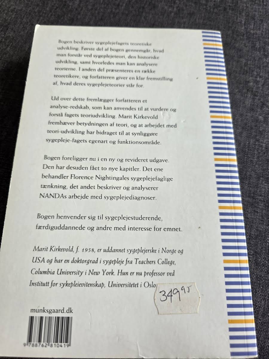 "Sygeplejeteorier – Analyse og evaluering" giver et indblik i sygeplejefagets teoretiske fundament og udvikling. Bogen er struktureret i to hoveddele, hvor den første del introducerer, hvad sygeplejeteori indebærer, og kortlægger den historiske udvikling samt de metoder, der benyttes til at analysere teorier. I den anden del sættes fokus på en række centrale teoretikere, hvis arbejde har haft stor betydning for fagets udvikling. Marit Kirkevold giver læseren et værdifuldt analyseredskab, der gør det nemmere at forstå og vurdere de forskellige teoretiske tilgange. Den reviderede tredje udgave præsenterer blandt andet nye kapitler, der omhandler Florence Nightingales tænkning samt NANDA’s arbejde med sygeplejediagnoser. Bogen henvender sig særligt til sygeplejestuderende, men er også en oplagt ressource for alle, der ønsker at opdatere deres viden om sygeplejeteorier og den faglige udvikling i sygeplejefaget.