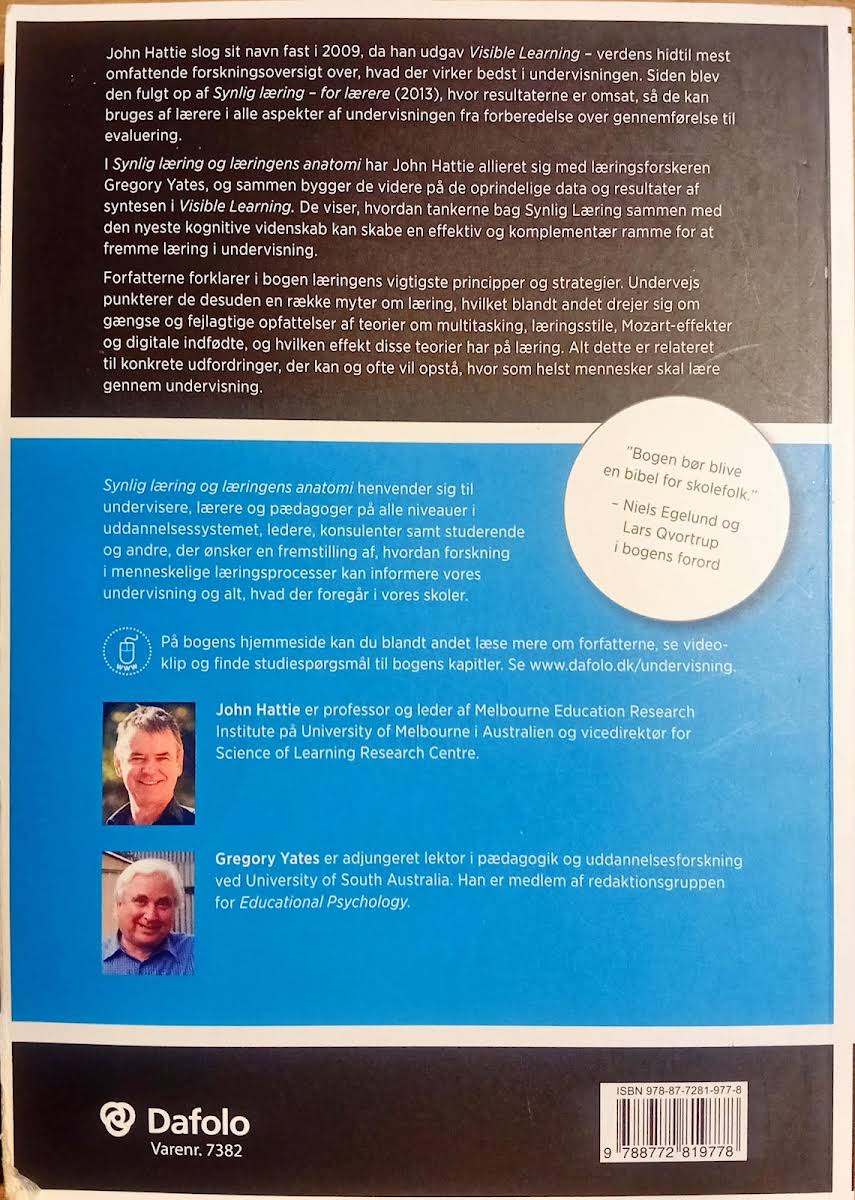 Synlig læring og læringens anatomi (inkl. hjemmeside) byder på et indsigtsfuldt indblik i, hvordan den nyeste forskning inden for kognitiv videnskab og begrebet synlig læring kan revolutionere vores tilgang til undervisning og læring. Forfatterne John Hattie og Gregory Yates formidler en dyb forståelse af, hvordan læringsprocesser fungerer, både i klasseværelset og hos den enkelte studerende. Bogen tilbyder en velstruktureret gennemgang af de centrale principper bag effektiv læreprocess og demonstrerer, hvordan konkrete strategier kan omsættes til praksis. Det engagerende sprog gør teksten til et værdifuldt redskab for både undervisere, lærere og studerende på videregående uddannelser, der ønsker at optimere undervisningens effektivitet. Med sin kombination af teoretiske perspektiver og praktiske eksempler åbner Synlig læring og læringens anatomi døren til en dybere forståelse af, hvordan vi bedst understøtter og styrker læringsudbyttet. Denne 460-siders bog, udgivet af Dafolo i 2014, er et must-have for alle, der ønsker et opdateret og omfattende overblik over moderne læringsteori.