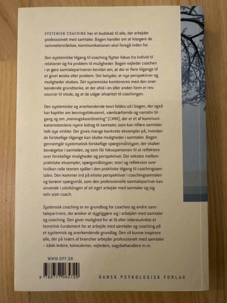 "Systemisk coaching – En grundbog" præsenterer en struktureret tilgang til coaching, der bygger på, at samtaler udvikles bedst inden for klare rammer og forståelser. Med udgangspunkt i den systemiske metode flyttes fokus fra individets udfordringer til relationernes potentiale, så nye perspektiver og muligheder træder frem. Bogen understreger, at coachens rolle er at gøre samtaleparten bevidst om de mange tilgange, der åbner for alternative løsninger. Gennem en kombination af systemisk og anerkendende teori illustreres, hvordan ressourcerne allerede er til stede, og hvordan de kan udnyttes i praksis. Med konkrete eksempler og en systematisk gennemgang af forskellige spørgsmålstyper får læseren redskaber til at skabe bevægelse og refleksion i samtalen. Desuden introduceres elementer fra løsningsfokuseret, værdsættende og narrativ coaching samt "meningskoordinering" (CMM – Coordinated Management of Meaning) som nyskabende tiltag i kommunikationsteorien. Som en grundbog for coachere og andre professionelle, der arbejder med samtaler, tilbyder denne bog inspirerende indsigter og praktiske redskaber til at udvikle en dybere forståelse af samtalens mange facetter.
