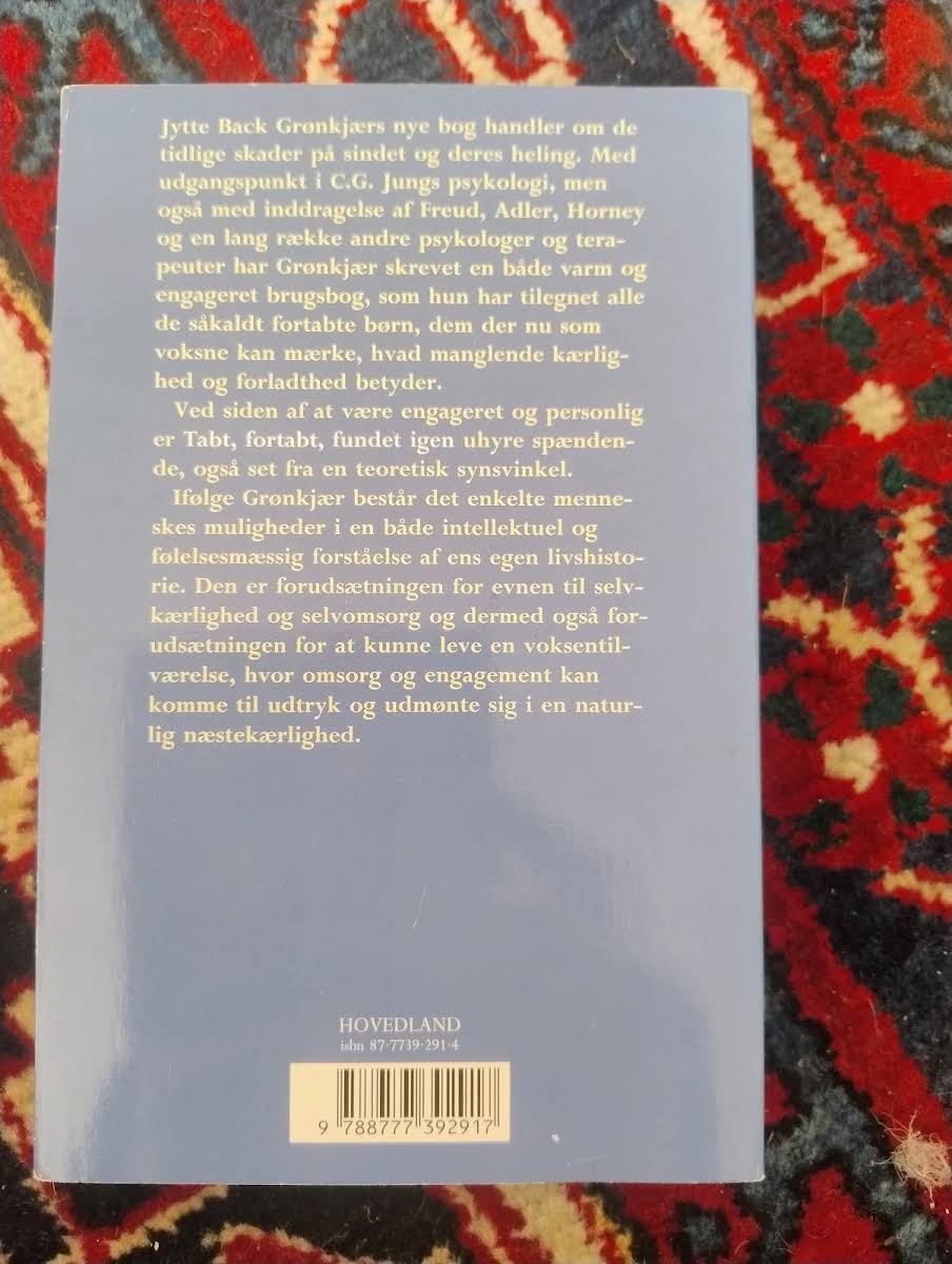 I "Tabt, Fortabt, Fundet Igen - Om tidlige skader på sindet og deres heling" sætter Jytte Back Grønkjær fokus på dybe sår fra barndommen og vejen mod at hele dem igen. Det faglige fundament tager primært afsæt i C.G. Jungs psykologi, men forfatteren inddrager desuden indsigter fra Freud, Adler, Horney og en række andre psykologer og terapeuter. Resultatet er en nærværende, varm og dybt engageret brugsbog. Grønkjær har tilegnet værket til de såkaldte fortabte børn. Bogen taler direkte til de voksne, der i dag stadig kan mærke de tunge konsekvenser af forladthed og manglende kærlighed i deres tidlige år.