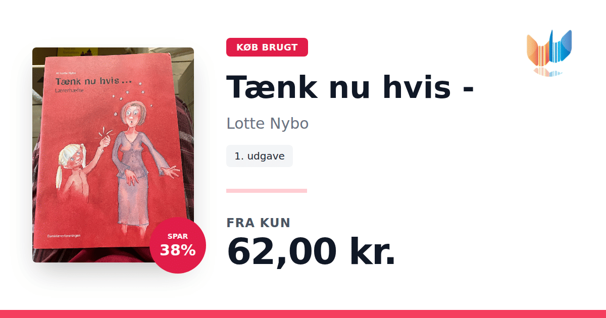Lige nu kan du købe "Tænk nu hvis -" af Lotte Nybo til kun 62,00 kr. Du sparer hele 38% af nyprisen! Bogen du ser her er brugt, og i god stand. Vi har i øjeblikket 2 eksemplarer til salg af "Tænk nu hvis -", så husk at se de forskellige udgaver.