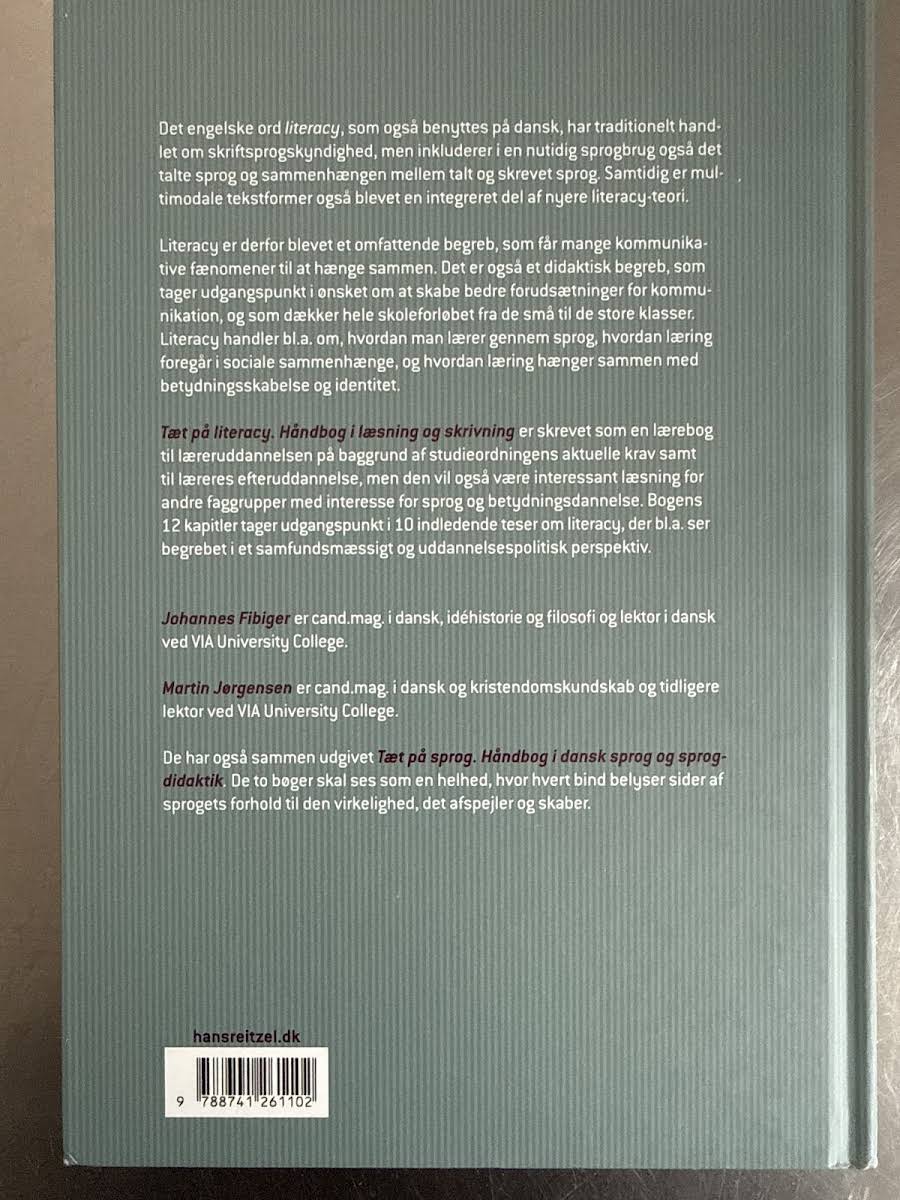 Tæt på literacy udforsker det moderne begreb literacy, der ikke alene omfatter evnen til at læse og skrive, men også den sammenhæng, der skabes mellem talt og skrevet sprog. I takt med at multimodale tekstformer er blevet uundværlige, fremstår literacy som et centralt fænomen i forståelsen af, hvordan sprog forbinder kommunikation, læring og identitetsdannelse. Med sine 12 kapitler og 10 grundteser tilbyder bogen et didaktisk værktøj, der understøtter både læreruddannelse og læreres efteruddannelse. Den præsenterer et bredt perspektiv, hvor literacy ses ud fra samfundsmæssige og uddannelsespolitiske linser, og giver dermed et solidt fundament for pædagogisk praksis og refleksion over sprogbrug. Martin Jørgensen og Johannes Fibiger, med deres baggrund i danskfag og pædagogik, leverer en inspirerende og nuanceret fremstilling af, hvordan literacy kan fremme forståelsen af sprogets rolle i skabelsen af mening i hverdagen. Tæt på literacy er dermed en alsidig ressource for alle, der ønsker at sætte sig ind i sprogets mange facetter og dets betydning for læring og kommunikation.