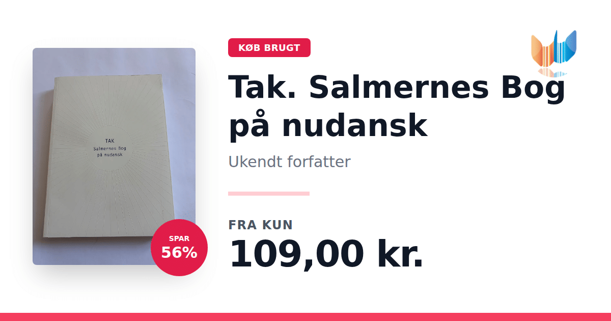 Lige nu kan du købe "Tak. Salmernes Bog på nudansk" af Ukendt forfatter til kun 109,00 kr. Du sparer hele 56% af nyprisen! Bogen du ser her er brugt, og i god stand. Vi har i øjeblikket kun et enkelt eksemplar til salg af "Tak. Salmernes Bog på nudansk", så slå til mens du kan!