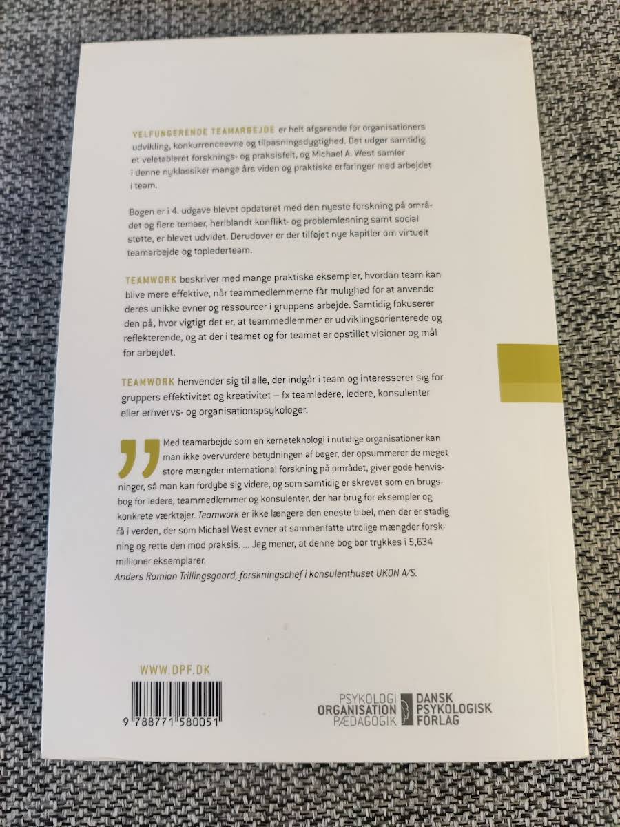 I en verden, hvor effektivt samarbejde er nøglen til succes, præsenterer Michael A. West i "Teamwork – Metoder til effektivt samarbejde" en omfattende guide til, hvordan teams kan opnå deres fulde potentiale. I bogens fjerde udgave fra 2014 kombineres nyeste forskning med praktiske metoder, der styrker både kreativiteten og effektiviteten i samarbejdet. Med indsigtsfulde eksempler og konkrete cases viser West, hvordan man identificerer og udnytter de enkelte teammedlemmers unikke ressourcer. Bogen dykker ned i centrale emner som konfliktløsning, problemløsning og opbygningen af effektive virtuelle teams og toplederteams. Uanset om man er teamleder, konsulent eller arbejder med teamudvikling i andre former, er denne opdaterede udgave et uundværligt redskab for at skabe et velfungerende og dynamisk samarbejde.