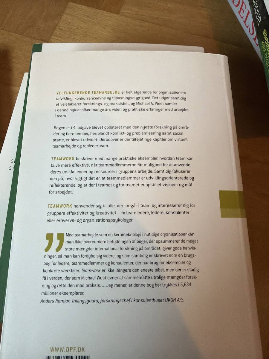 I en verden, hvor effektivt samarbejde er nøglen til succes, præsenterer Michael A. West i "Teamwork – Metoder til effektivt samarbejde" en omfattende guide til, hvordan teams kan opnå deres fulde potentiale. I bogens fjerde udgave fra 2014 kombineres nyeste forskning med praktiske metoder, der styrker både kreativiteten og effektiviteten i samarbejdet. Med indsigtsfulde eksempler og konkrete cases viser West, hvordan man identificerer og udnytter de enkelte teammedlemmers unikke ressourcer. Bogen dykker ned i centrale emner som konfliktløsning, problemløsning og opbygningen af effektive virtuelle teams og toplederteams. Uanset om man er teamleder, konsulent eller arbejder med teamudvikling i andre former, er denne opdaterede udgave et uundværligt redskab for at skabe et velfungerende og dynamisk samarbejde.