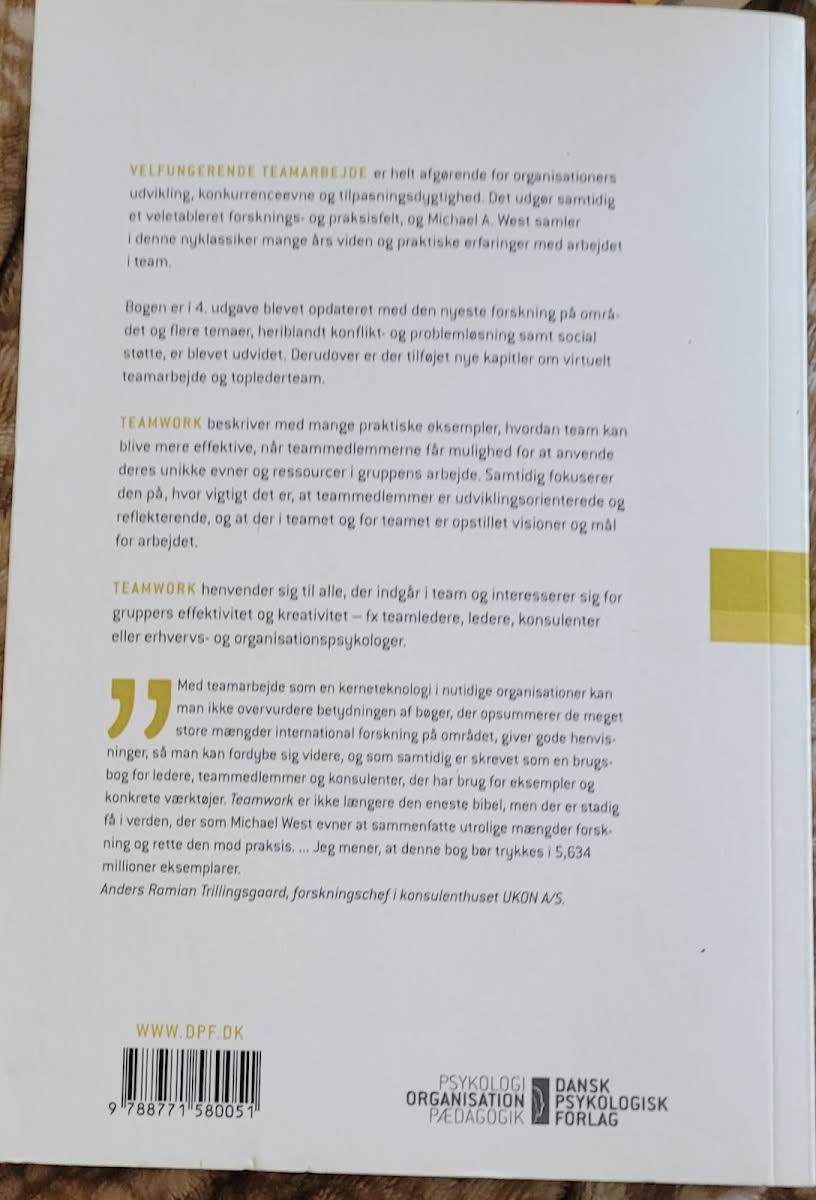 I en verden, hvor effektivt samarbejde er nøglen til succes, præsenterer Michael A. West i "Teamwork – Metoder til effektivt samarbejde" en omfattende guide til, hvordan teams kan opnå deres fulde potentiale. I bogens fjerde udgave fra 2014 kombineres nyeste forskning med praktiske metoder, der styrker både kreativiteten og effektiviteten i samarbejdet. Med indsigtsfulde eksempler og konkrete cases viser West, hvordan man identificerer og udnytter de enkelte teammedlemmers unikke ressourcer. Bogen dykker ned i centrale emner som konfliktløsning, problemløsning og opbygningen af effektive virtuelle teams og toplederteams. Uanset om man er teamleder, konsulent eller arbejder med teamudvikling i andre former, er denne opdaterede udgave et uundværligt redskab for at skabe et velfungerende og dynamisk samarbejde.