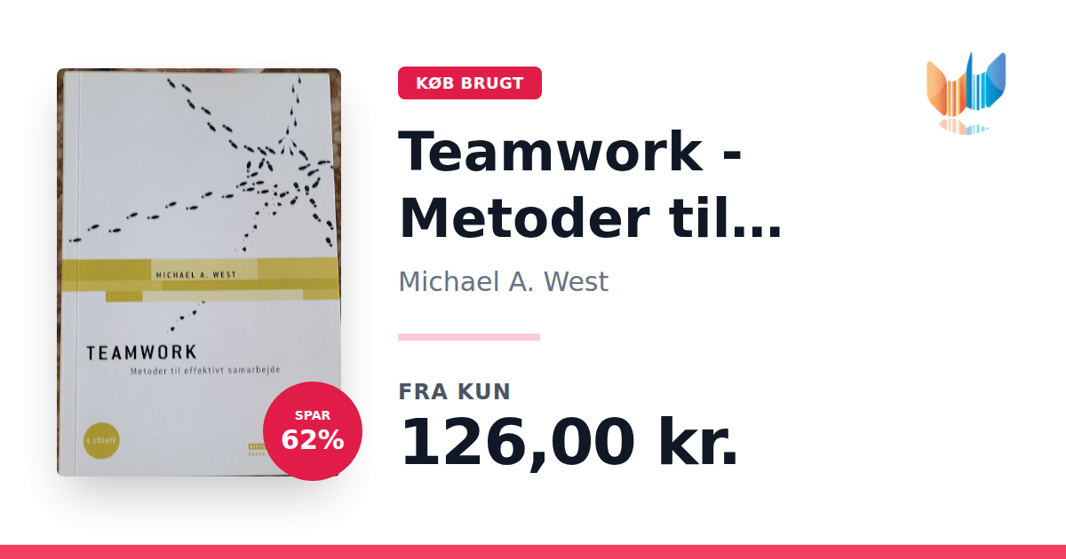 Lige nu kan du købe "Teamwork - Metoder til effektivt samarbejde" af Michael A. West til kun 126,00 kr. Du sparer hele 62% af nyprisen! Bogen du ser her er brugt, og i perfekt stand. Vi har i øjeblikket 2 eksemplarer til salg af "Teamwork - Metoder til effektivt samarbejde", så husk at se de forskellige udgaver.