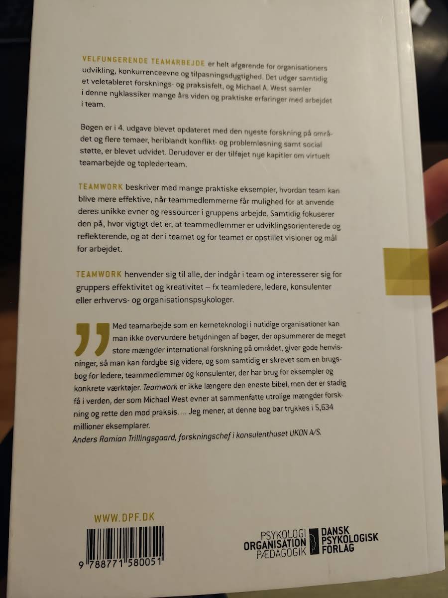 I en verden, hvor effektivt samarbejde er nøglen til succes, præsenterer Michael A. West i "Teamwork – Metoder til effektivt samarbejde" en omfattende guide til, hvordan teams kan opnå deres fulde potentiale. I bogens fjerde udgave fra 2014 kombineres nyeste forskning med praktiske metoder, der styrker både kreativiteten og effektiviteten i samarbejdet. Med indsigtsfulde eksempler og konkrete cases viser West, hvordan man identificerer og udnytter de enkelte teammedlemmers unikke ressourcer. Bogen dykker ned i centrale emner som konfliktløsning, problemløsning og opbygningen af effektive virtuelle teams og toplederteams. Uanset om man er teamleder, konsulent eller arbejder med teamudvikling i andre former, er denne opdaterede udgave et uundværligt redskab for at skabe et velfungerende og dynamisk samarbejde.