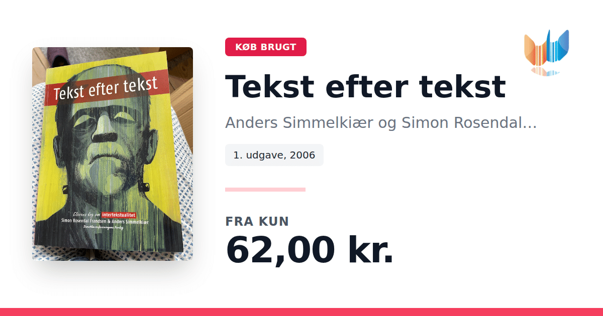 Lige nu kan du købe "Tekst efter tekst" af Anders Simmelkiær og Simon Rosendal Frandsen til kun 62,00 kr. Bogen du ser her er brugt, og i god stand. Vi har i øjeblikket 4 eksemplarer til salg af "Tekst efter tekst", så husk at se de forskellige udgaver.