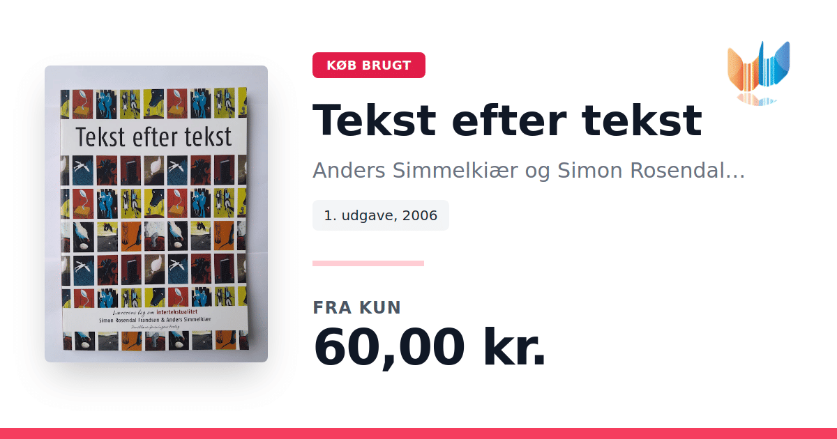 Lige nu kan du købe "Tekst efter tekst" af Anders Simmelkiær og Simon Rosendal Frandsen til kun 60,00 kr. Bogen du ser her er brugt, og i perfekt stand. Vi har i øjeblikket 4 eksemplarer til salg af "Tekst efter tekst", så husk at se de forskellige udgaver.