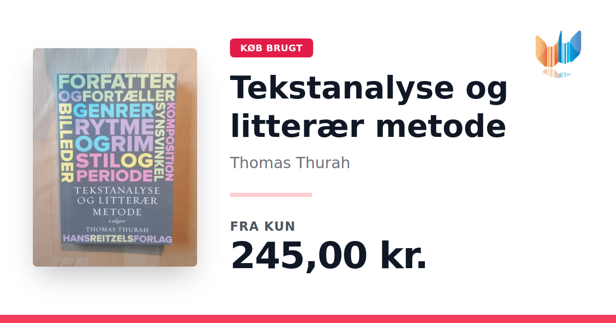 Lige nu kan du købe "Tekstanalyse og litterær metode" af Thomas Thurah til kun 245,00 kr. Bogen du ser her er brugt, og i perfekt stand. Vi har i øjeblikket 2 eksemplarer til salg af "Tekstanalyse og litterær metode", så husk at se de forskellige udgaver.