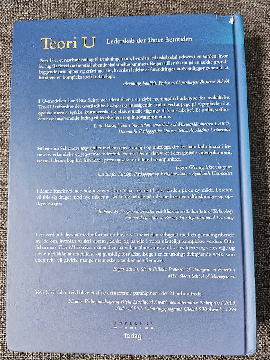 I Teori U udforsker C. Otto Scharmer nye veje for lederskab, læring og forandring. Bogen præsenterer den unikke idé om "presencing" – en tilgang, hvor fremtidens muligheder træder frem gennem en dybdegående indre rejse, som illustreres ved en U-formet proces, der symboliserer bevægelsen fra observation til handling. Gennem en inspirerende og reflekterende proces viser Scharmer, hvordan vi kan aktivere nye sociale teknologier og skabe bæredygtige løsninger i en verden under konstant forandring. Med sine 484 sider kombinerer Teori U teoretiske indsigter med praktiske redskaber, der giver læseren en stærk ramme for både personlig og organisatorisk transformation. Udgivet i 2008 i paperback, står bogen stadig som et vigtigt bidrag til moderne ledelsesteori og en opfordring til at åbne op for en fremtid, der omfavner det innovative og transformative potentiale i menneskelig handling.