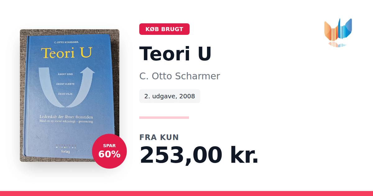 Lige nu kan du købe "Teori U" af C. Otto Scharmer til kun 253,00 kr. Du sparer hele 60% af nyprisen! Bogen du ser her er brugt, og i god stand. Vi har i øjeblikket 4 eksemplarer til salg af "Teori U", så husk at se de forskellige udgaver.