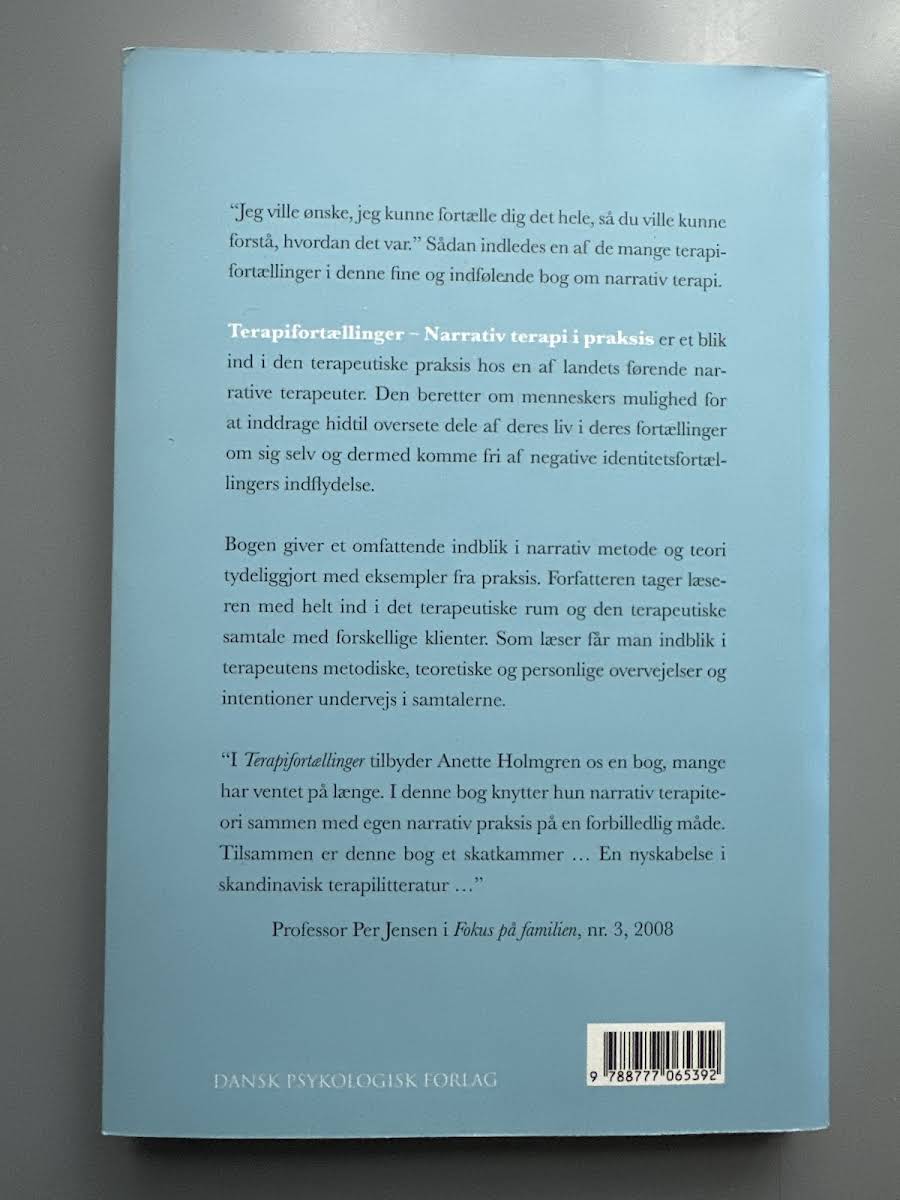 I "Terapifortællinger" får læseren et nærgående indblik i, hvordan narrativ terapi omsætter menneskers livshistorier til et redskab for forandring. Bogen følger terapeutiske samtaler, hvor klienternes nye perspektiver og muligheder for at omskrive negative identitetsfortællinger kommer tydeligt til udtryk. Anette Holmgren præsenterer med stor pedagogisk sans både de metodiske og teoretiske overvejelser bag den narrative tilgang. Med et sprog, der både er levende og fagligt solidt, illustrerer bogen, hvordan terapeutens arbejde baner vejen for en dybere forståelse af individets historie. "Terapifortællinger" henvender sig til såvel professionelle og studerende som alle med en generel interesse for, hvordan fortællinger kan påvirke og forme vores liv.