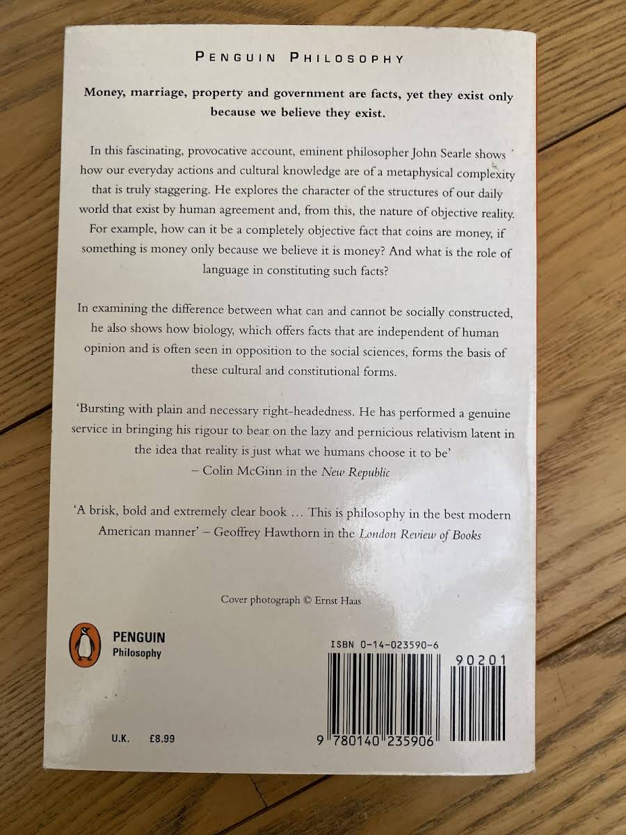 Denne korte afhandling udforsker, hvordan vi gennem sansningen af omverdenen konstruerer en social virkelighed. John Searle demonstrerer, hvordan vi ved at tillægge objekter særlige funktioner og betydninger skaber en fælles forståelsesramme. Som illustration viser han, hvordan et simpelt stykke trykt papir bliver til en pengeseddel med en værdi - en "five-pound note". Samtidig belyser han, hvordan denne sociale genstand rummer både økonomiske og kulturelle implikationer, som går ud over det fysiske materiale. Bogen klargør de grundlæggende mekanismer bag alle former for sociale konstruktioner. Searle fastslår, at vores fælles intentioner og aftaler er fundamentet for det, vi opfatter som samfundets byggesten.