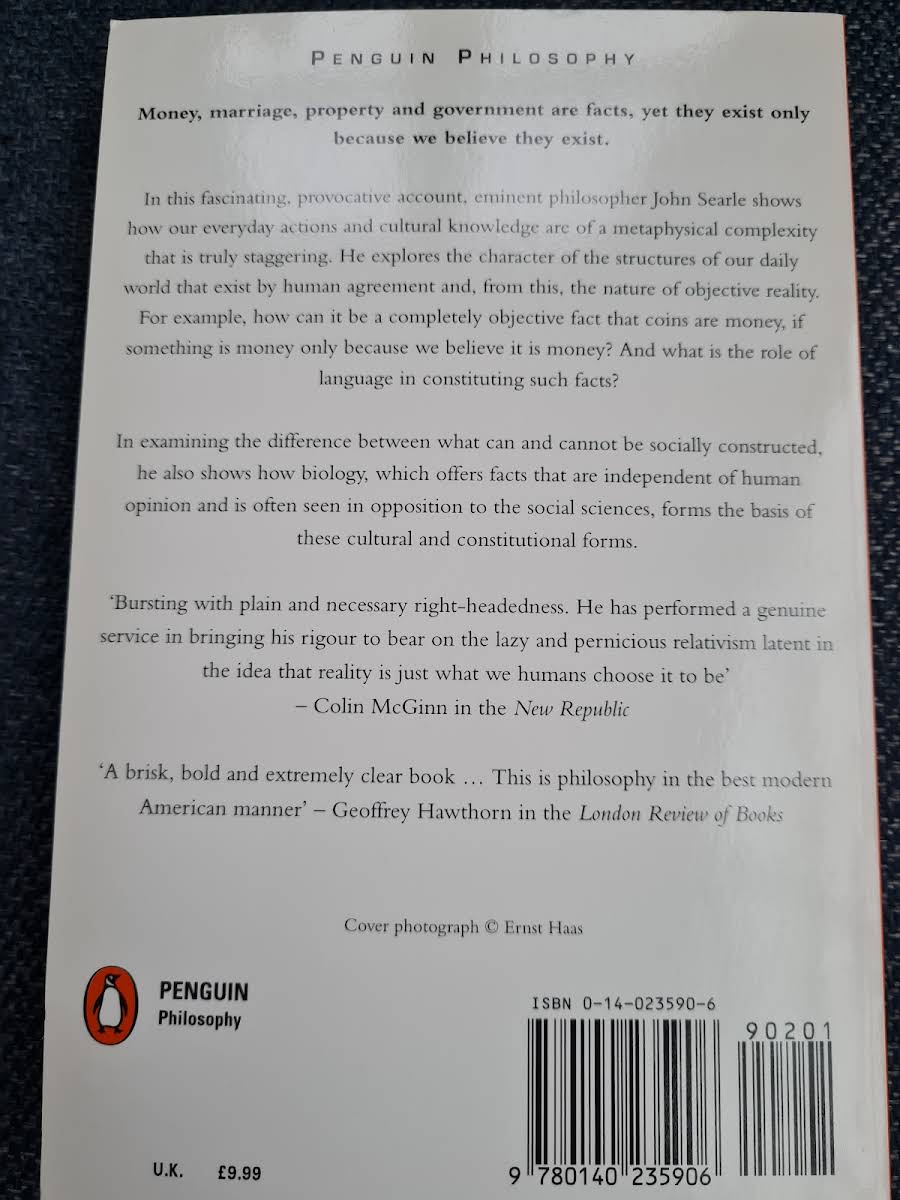 Denne korte afhandling udforsker, hvordan vi gennem sansningen af omverdenen konstruerer en social virkelighed. John Searle demonstrerer, hvordan vi ved at tillægge objekter særlige funktioner og betydninger skaber en fælles forståelsesramme. Som illustration viser han, hvordan et simpelt stykke trykt papir bliver til en pengeseddel med en værdi - en "five-pound note". Samtidig belyser han, hvordan denne sociale genstand rummer både økonomiske og kulturelle implikationer, som går ud over det fysiske materiale. Bogen klargør de grundlæggende mekanismer bag alle former for sociale konstruktioner. Searle fastslår, at vores fælles intentioner og aftaler er fundamentet for det, vi opfatter som samfundets byggesten.
