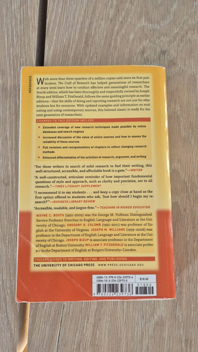 Siden første udgivelse har The Craft of Research solgt mere end trekvart million eksemplarer og hjulpet generationer af forskere - fra bachelorstuderende til erfarne medarbejdere i erhvervsliv og offentlig sektor - med at mestre kunsten at finde, vurdere og anvende kilder til skarpe argumenter. Wayne C. Booth, Gregory G. Colomb og Joseph M. Williams har skabt et grundlæggende værk, der viser, hvordan man lokaliserer relevante kilder, forudser og imødegår læserens spørgsmål og sammenføjer disse elementer til en sammenhængende og troværdig argumentation. I denne fjerde udgave, grundigt men respektfuldt revideret af Joseph Bizup og William T. FitzGerald, bevares den oprindelige femdelede struktur og de tidløse råd. Kapitlerne om kildefinding og engagement er opdateret med de seneste fremskridt inden for bibliotekstjenester, online databaser og søgemaskineteknikker. Bizup og FitzGerald tilfører nye, illustrative eksempler og ensartet terminologi, der tydeliggør centrale begreber som argument, warrant og problem. Med sin klare tone og direkte tilgang forbliver The Craft of Research en uundværlig guide til alle, der ønsker at løfte deres forsknings- og skrivefærdigheder. Dette paperback-eksemplar på 336 sider blev udgivet af University of Chicago Press i 2016 og cementerer The Craft of Research som et essentielt værktøj for både nye og erfarne forskere.