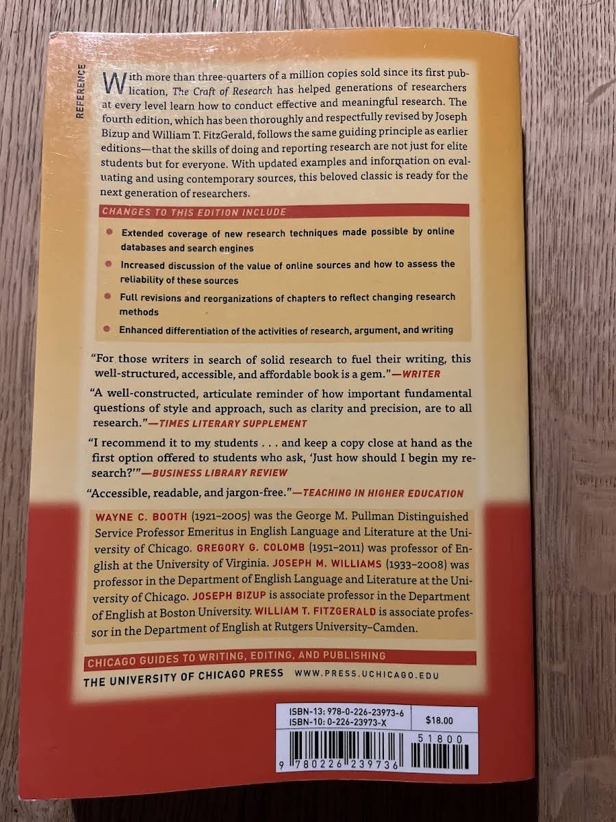 Siden første udgivelse har The Craft of Research solgt mere end trekvart million eksemplarer og hjulpet generationer af forskere - fra bachelorstuderende til erfarne medarbejdere i erhvervsliv og offentlig sektor - med at mestre kunsten at finde, vurdere og anvende kilder til skarpe argumenter. Wayne C. Booth, Gregory G. Colomb og Joseph M. Williams har skabt et grundlæggende værk, der viser, hvordan man lokaliserer relevante kilder, forudser og imødegår læserens spørgsmål og sammenføjer disse elementer til en sammenhængende og troværdig argumentation. I denne fjerde udgave, grundigt men respektfuldt revideret af Joseph Bizup og William T. FitzGerald, bevares den oprindelige femdelede struktur og de tidløse råd. Kapitlerne om kildefinding og engagement er opdateret med de seneste fremskridt inden for bibliotekstjenester, online databaser og søgemaskineteknikker. Bizup og FitzGerald tilfører nye, illustrative eksempler og ensartet terminologi, der tydeliggør centrale begreber som argument, warrant og problem. Med sin klare tone og direkte tilgang forbliver The Craft of Research en uundværlig guide til alle, der ønsker at løfte deres forsknings- og skrivefærdigheder. Dette paperback-eksemplar på 336 sider blev udgivet af University of Chicago Press i 2016 og cementerer The Craft of Research som et essentielt værktøj for både nye og erfarne forskere.